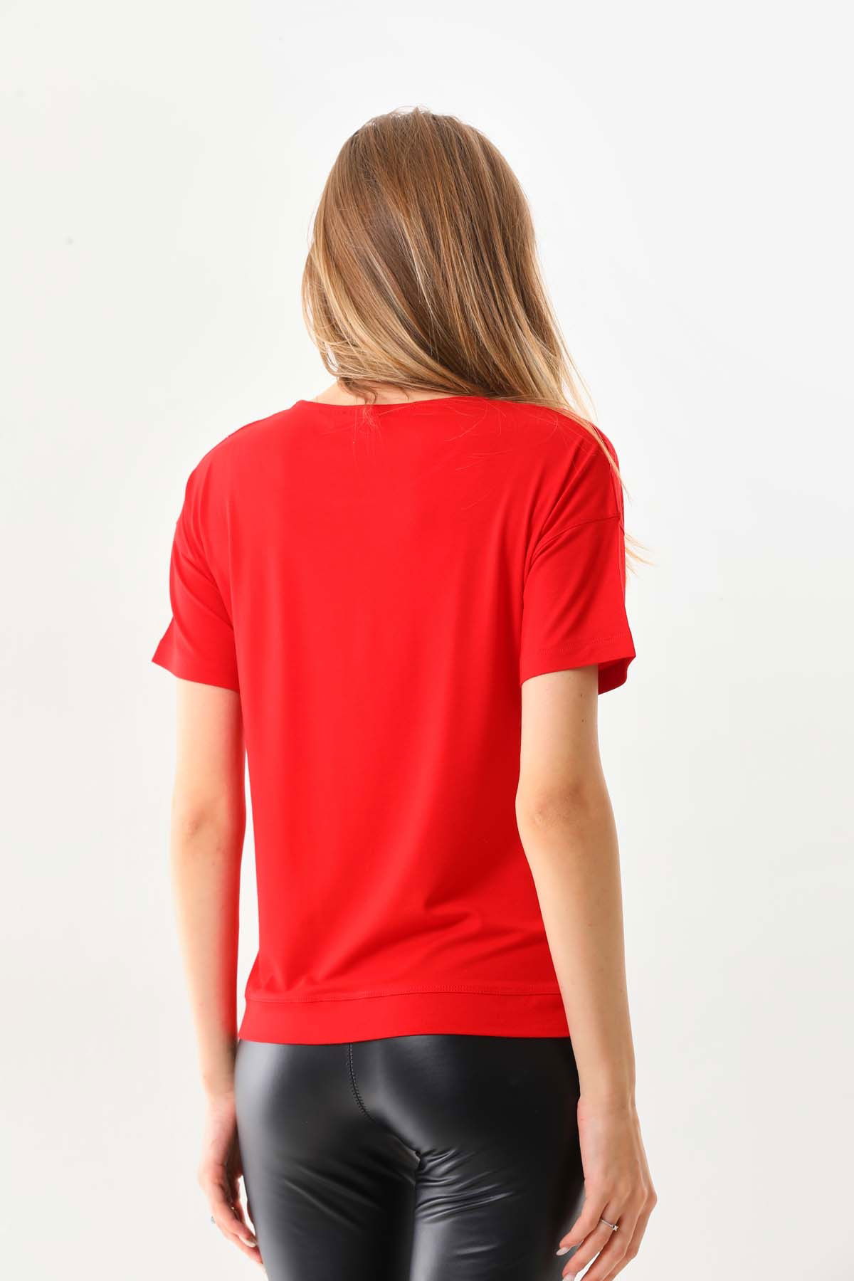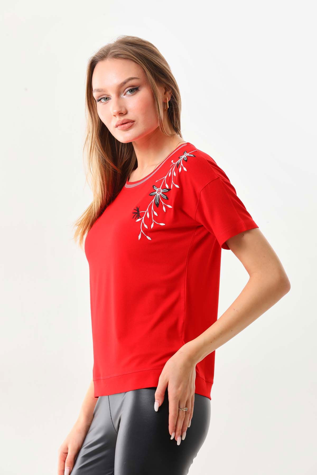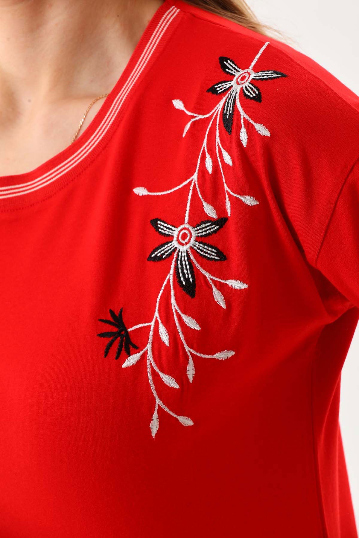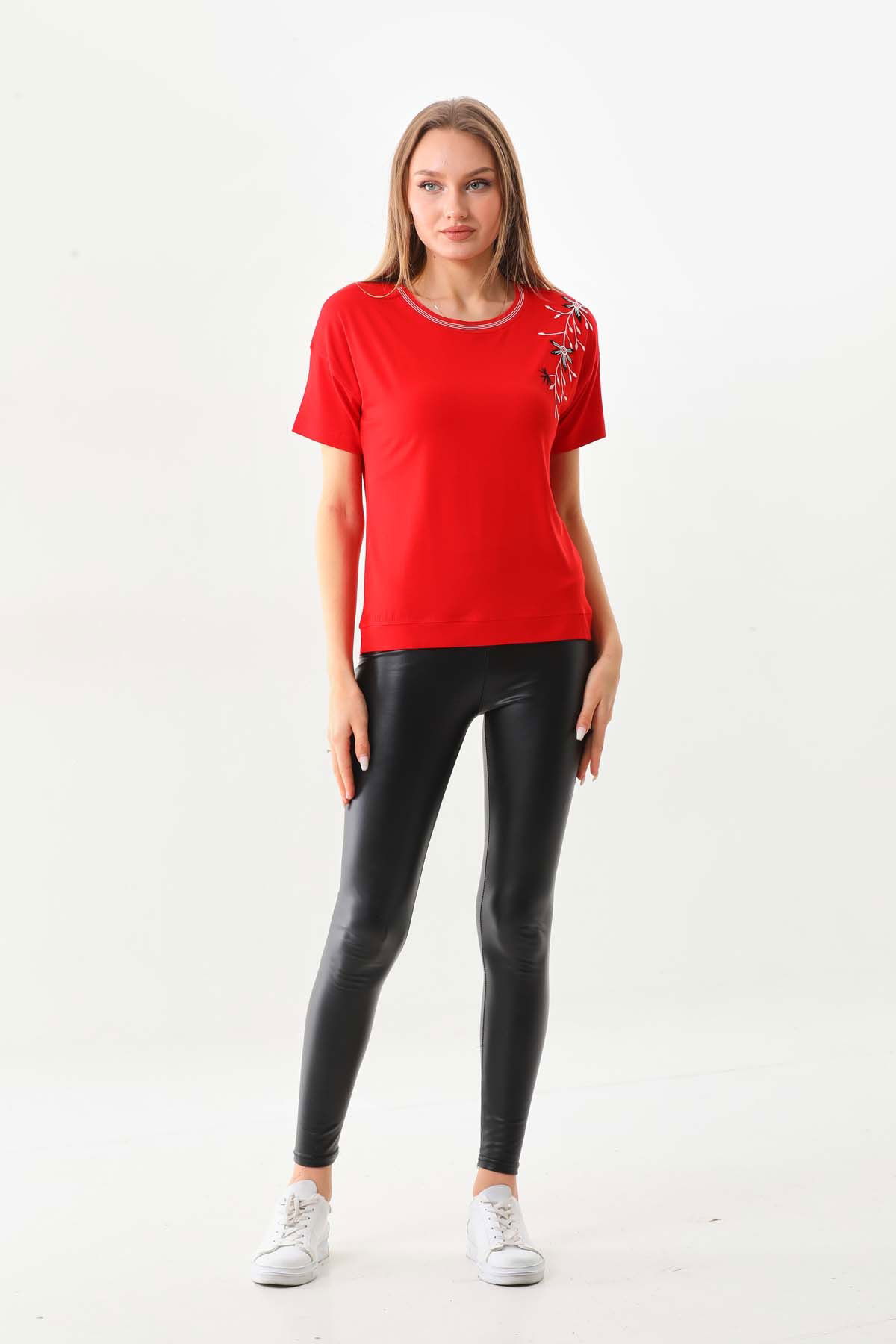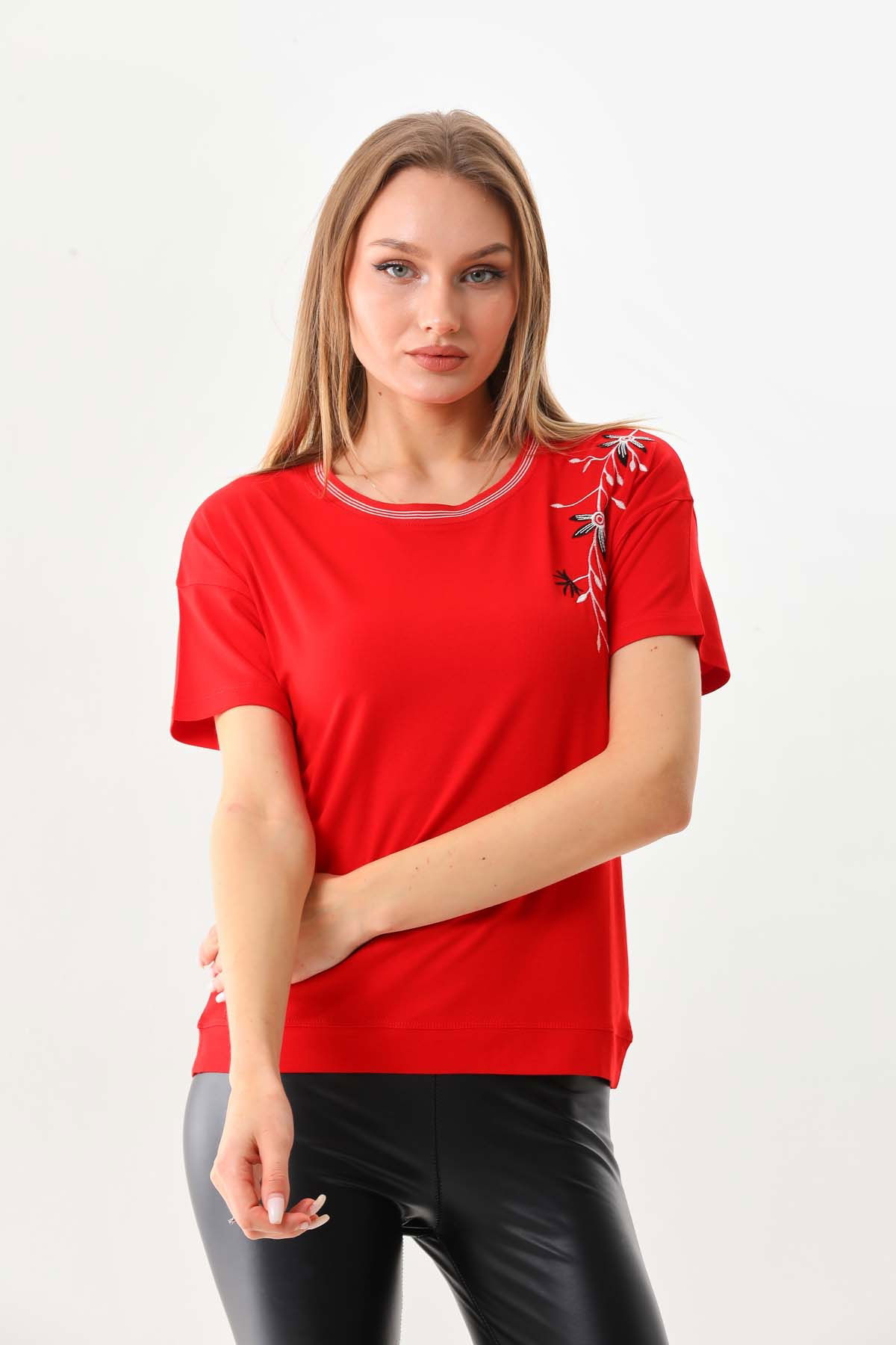Detay: Kısa kol, bisiklet yaka bluz;