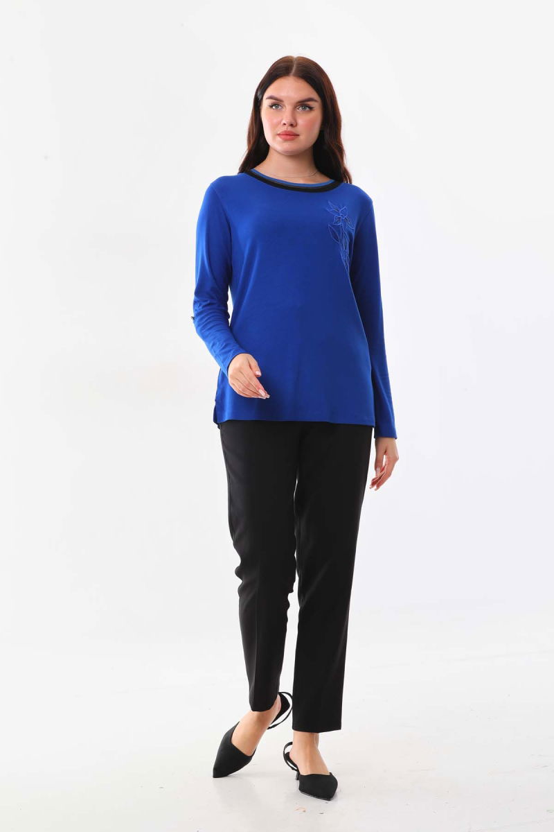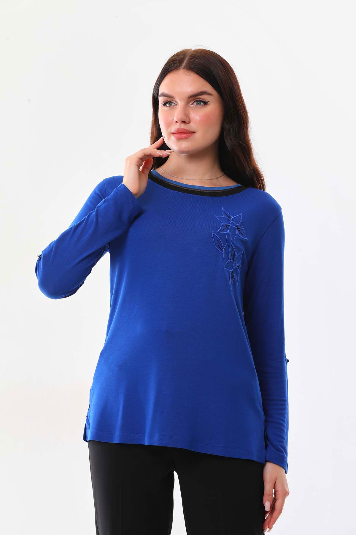 Detay: Bisiklet yaka, çiçek işlemeli, uzun kol bluz;