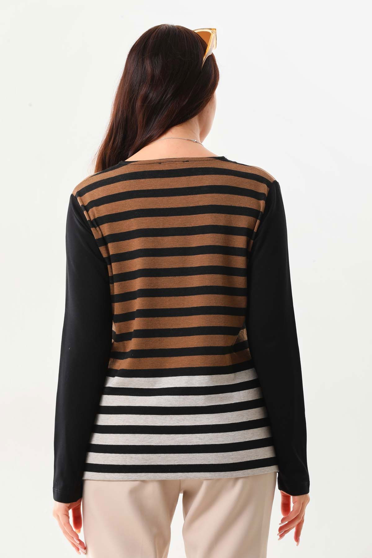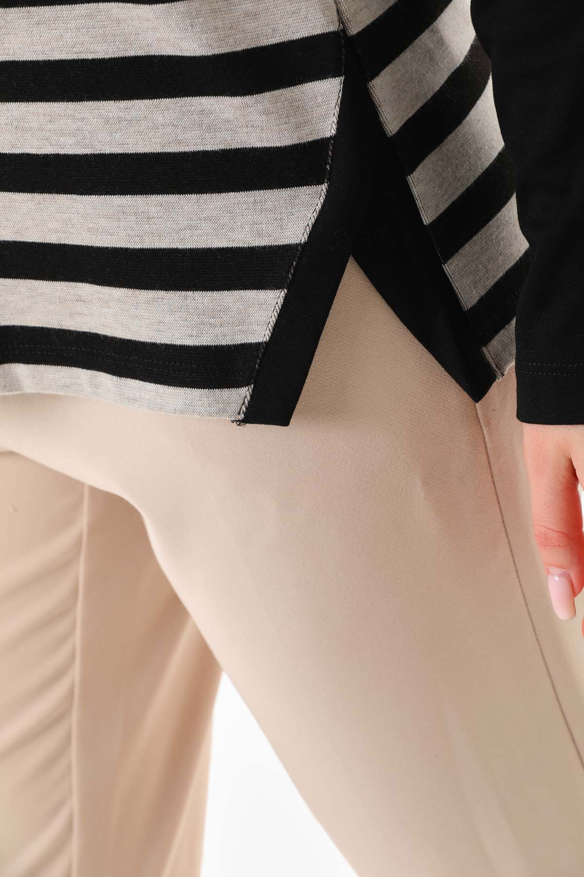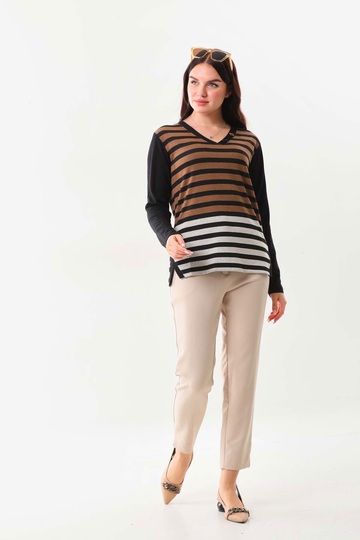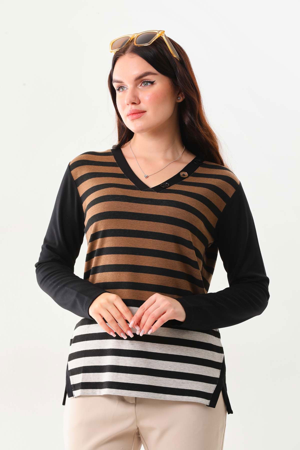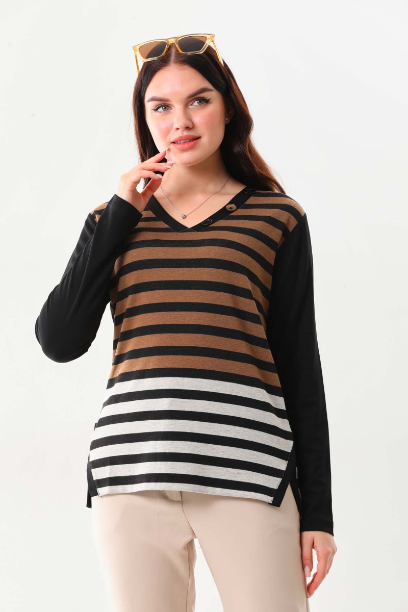 Detay: Çizgili, yaka kısmı düğme detaylı, yan kısımları yırtmaçlı, uzun kol bluz;