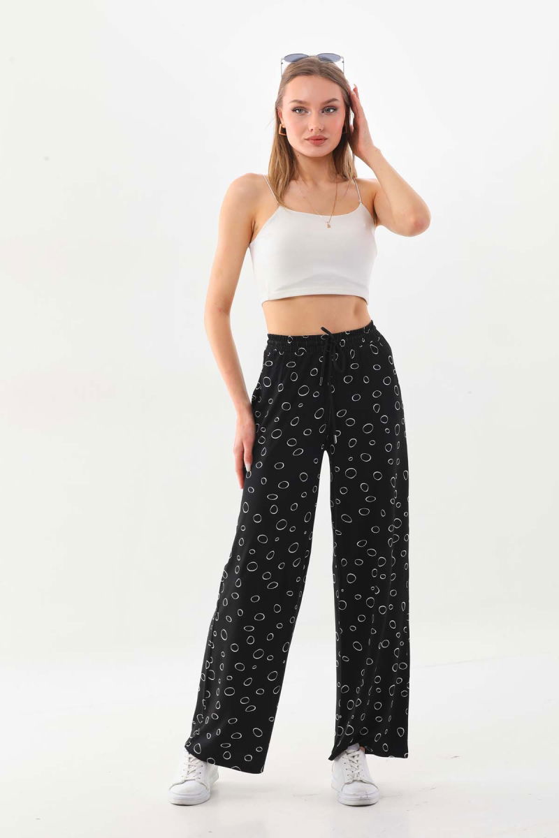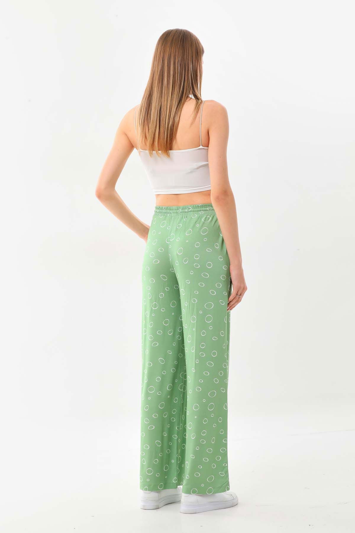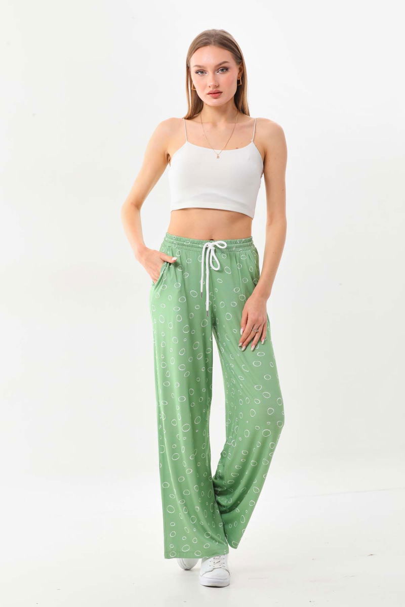 Detay: Desenli, belden bağlamalı, lastikli pantolon;