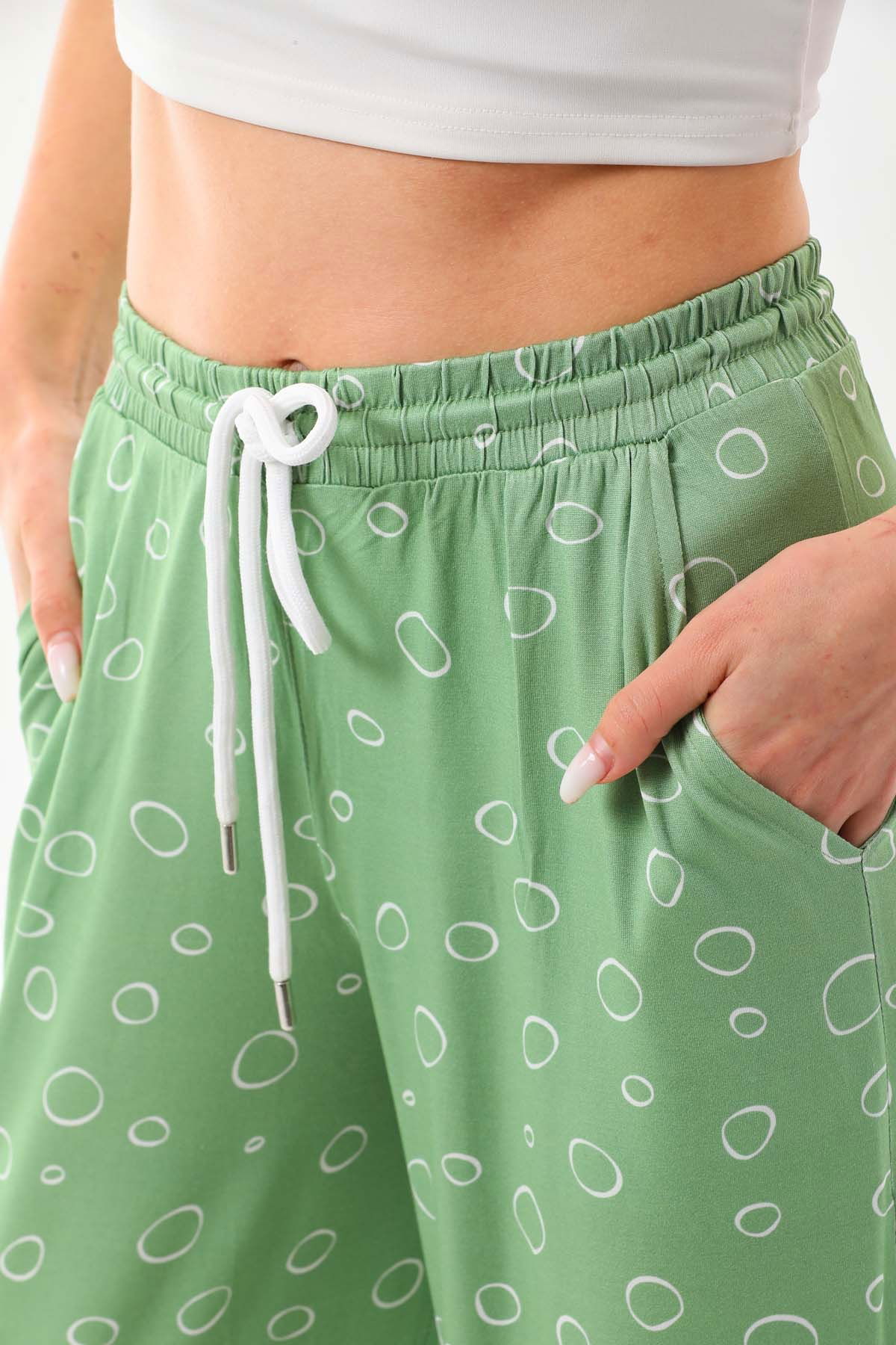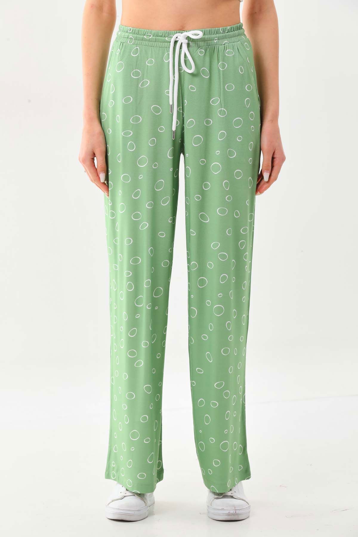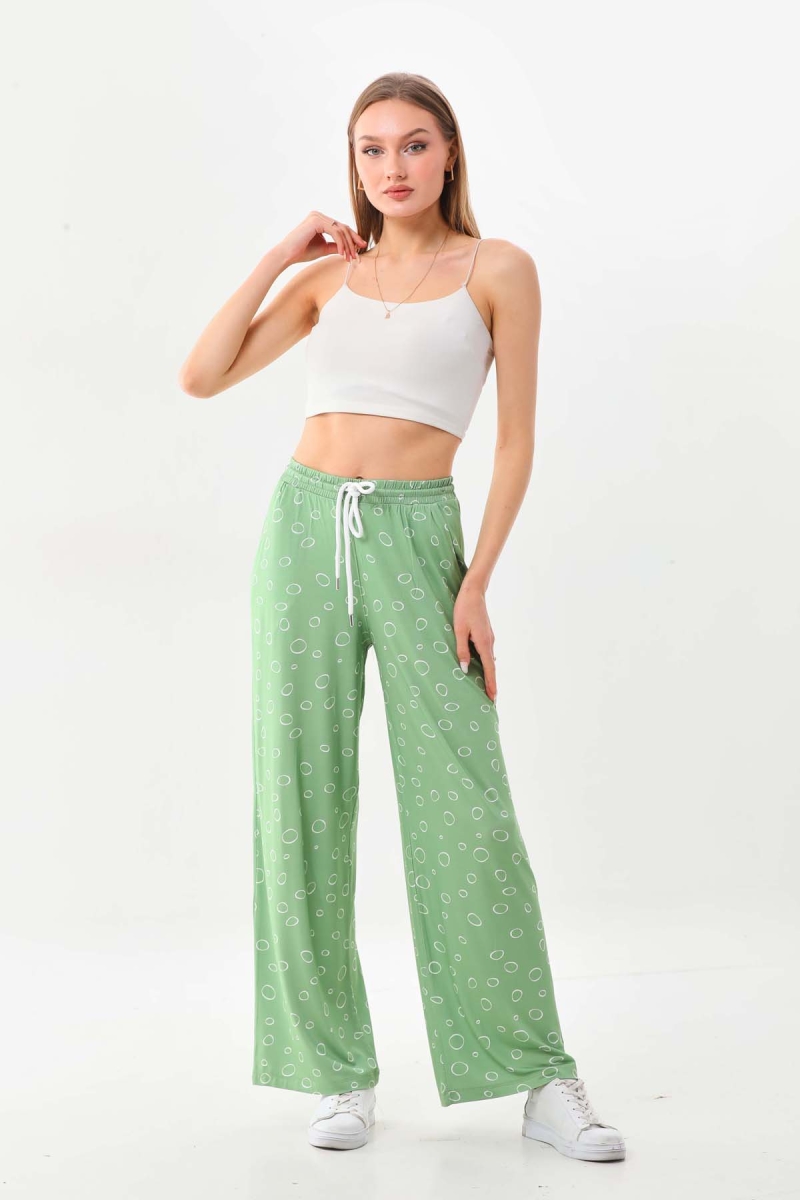 Detay: Desenli, belden bağlamalı, lastikli pantolon;