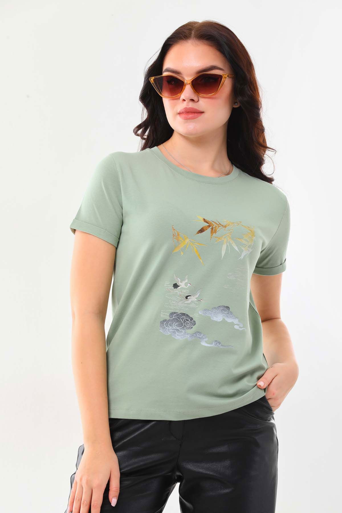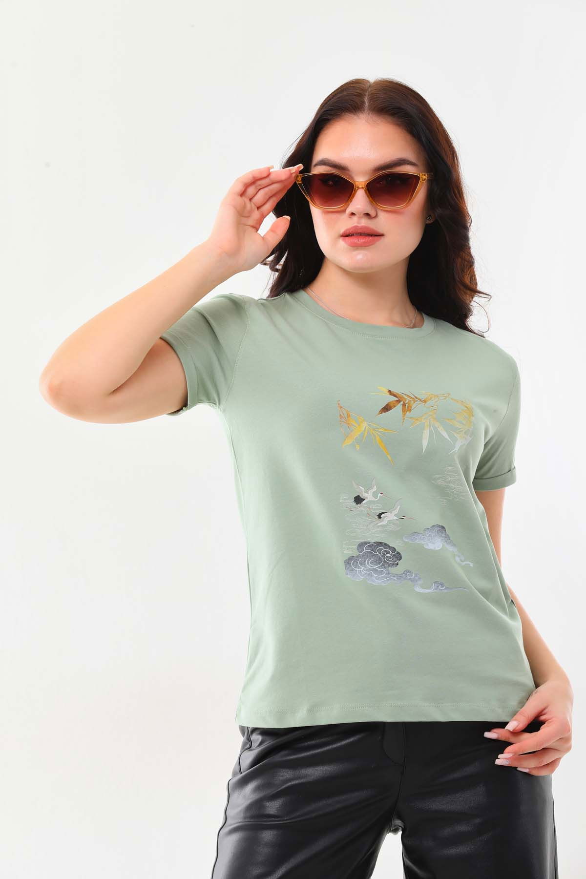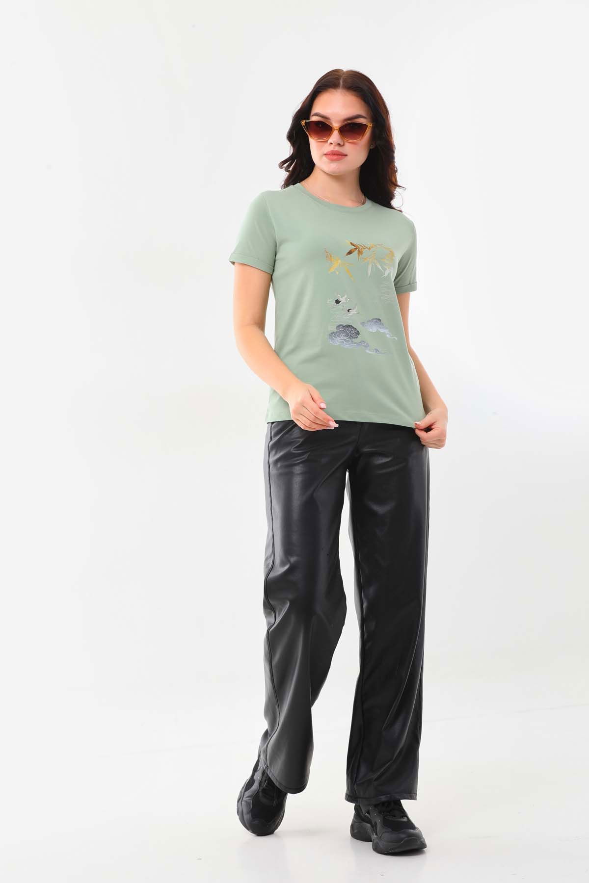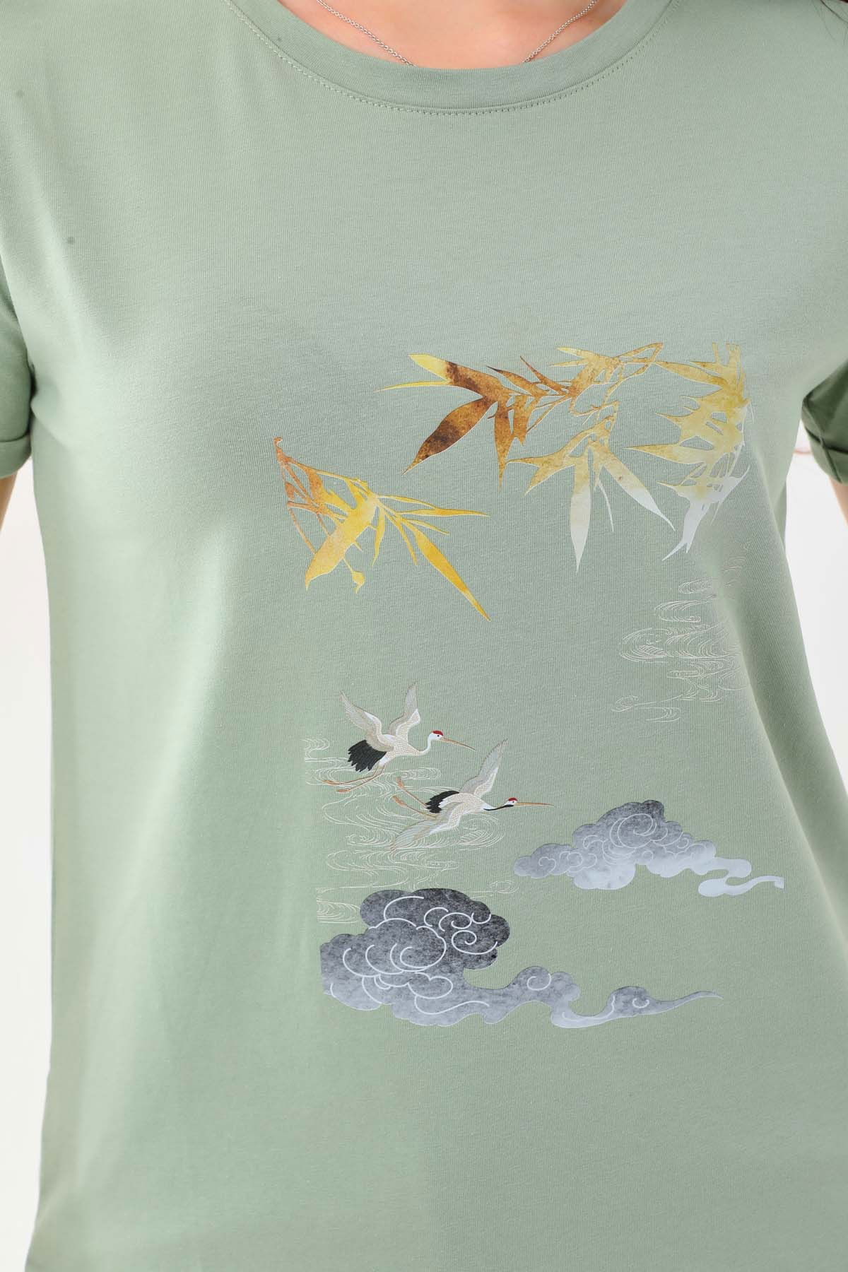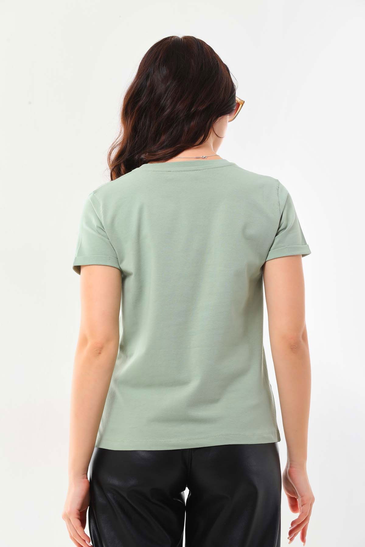 Sistas Kadın Desenli Bisiklet Yaka Kısa Kol Pamuklu Bluz 23056 Çağla