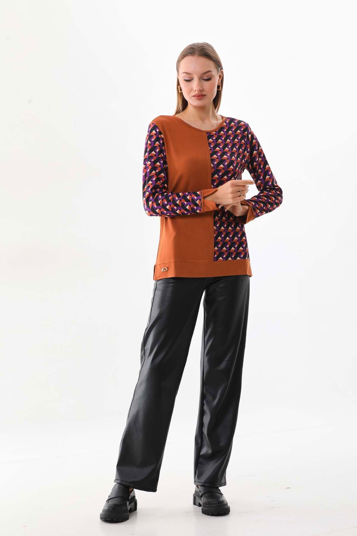 Sistas Kadın Desenli Bisiklet Yaka Uzun Kol Bluz 23592 Camel