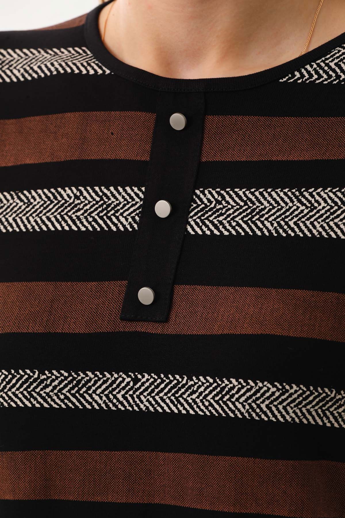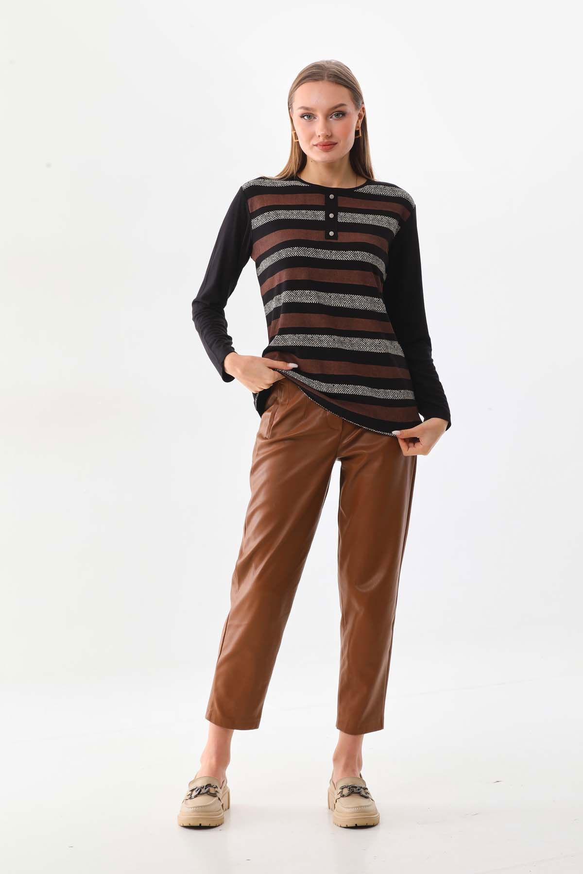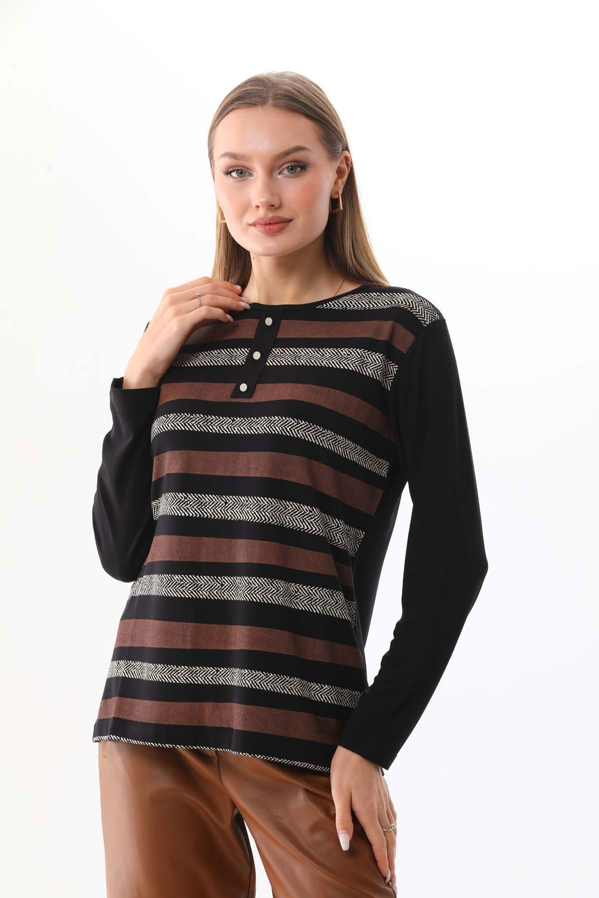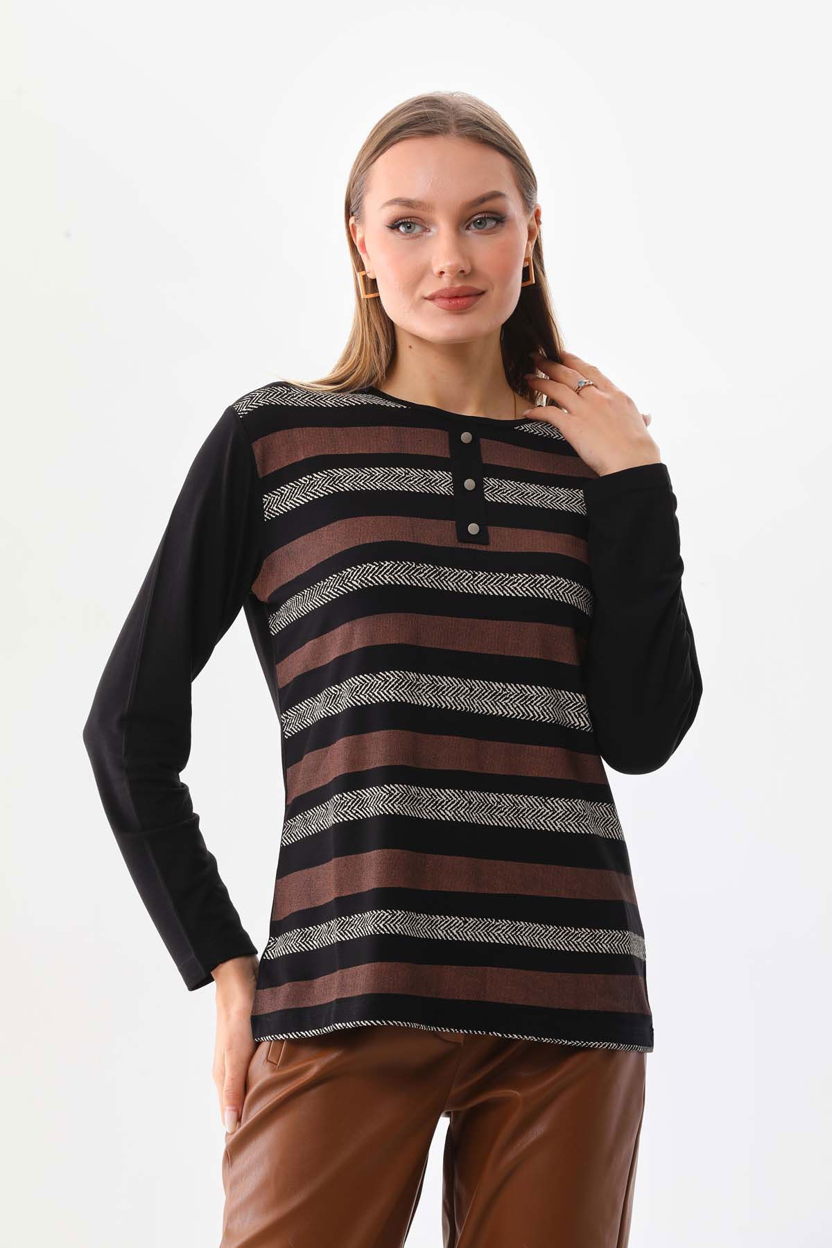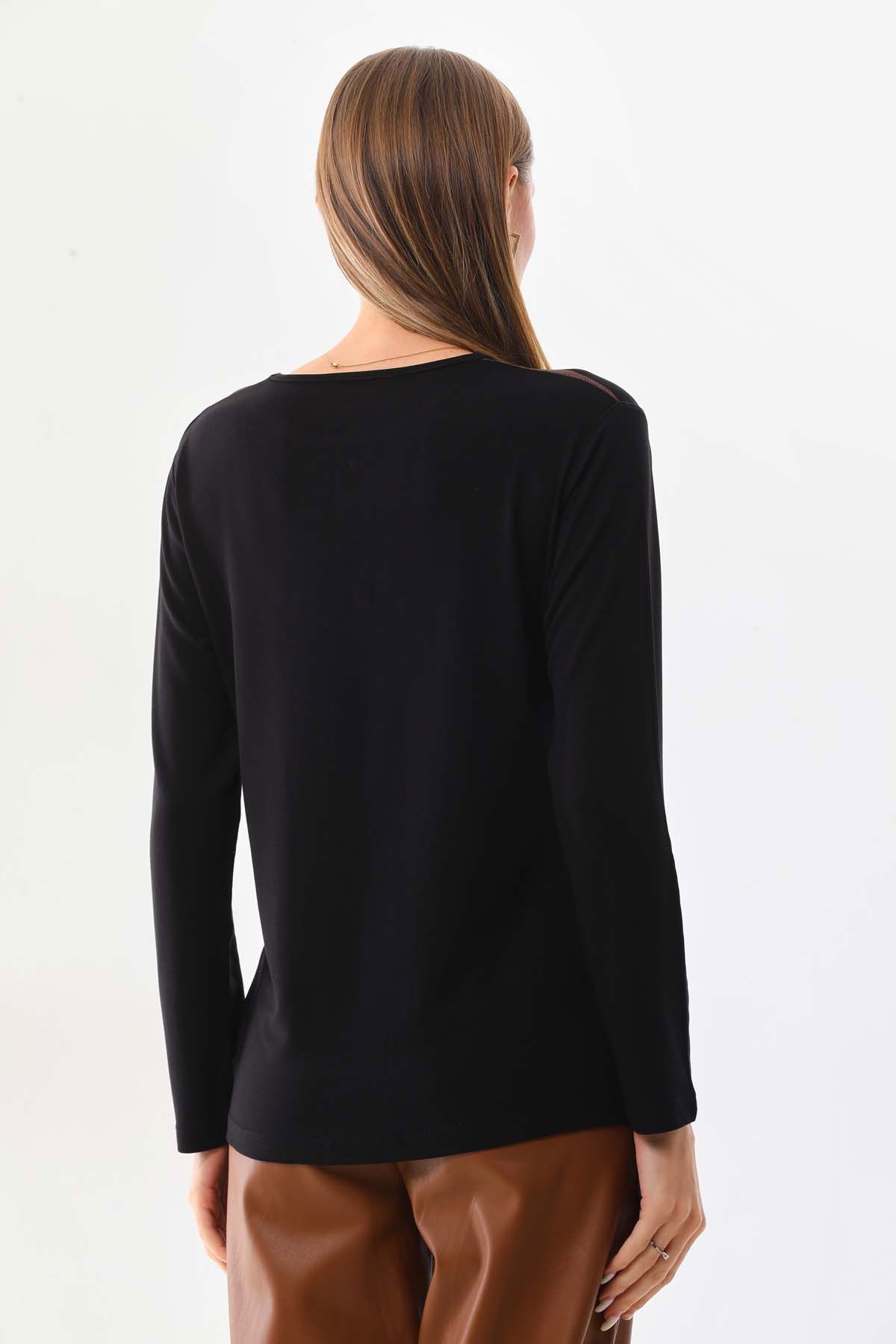Sistas Kadın Desenli Bisiklet Yaka Uzun Kol Bluz 23596 Siyah