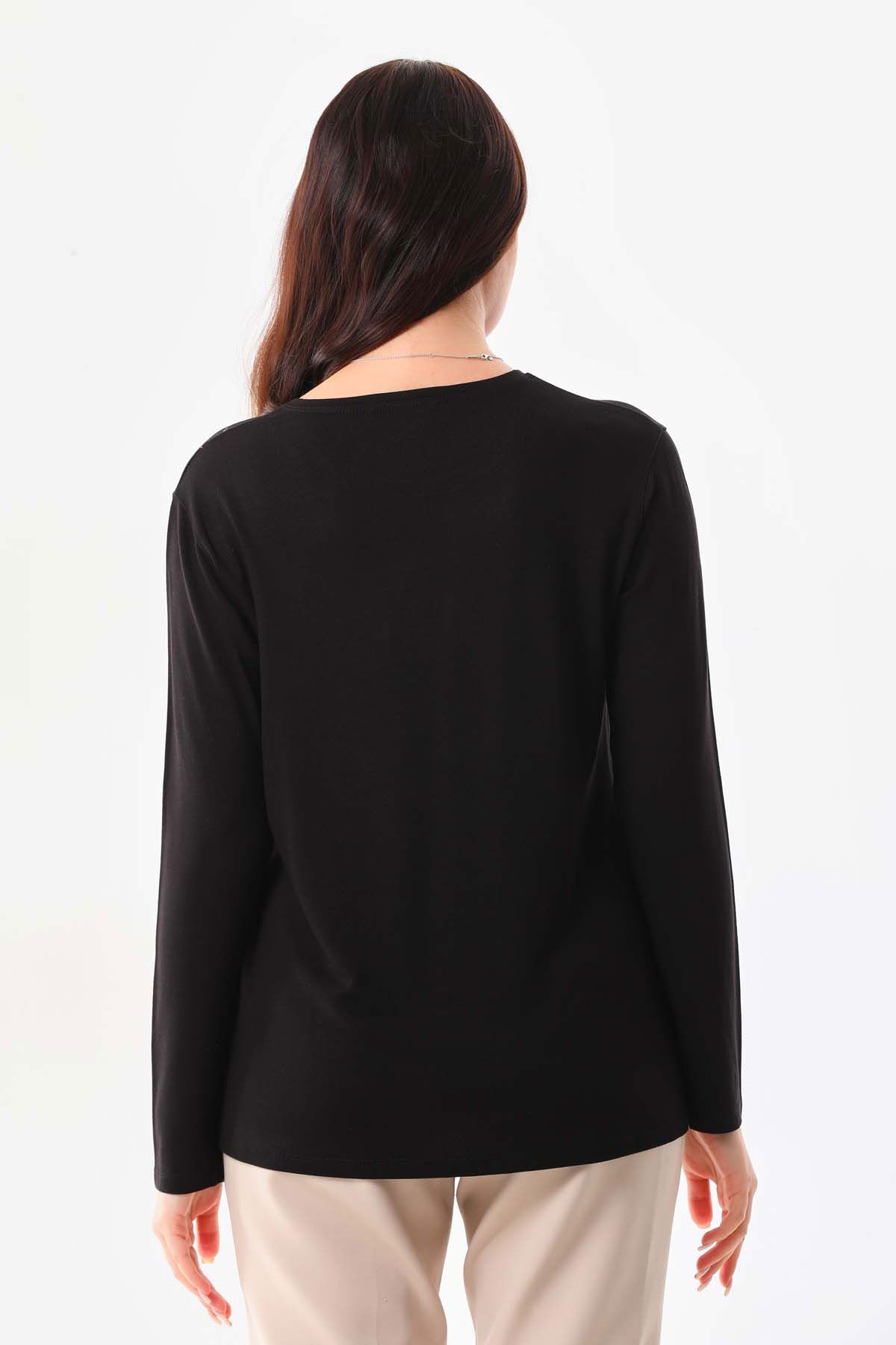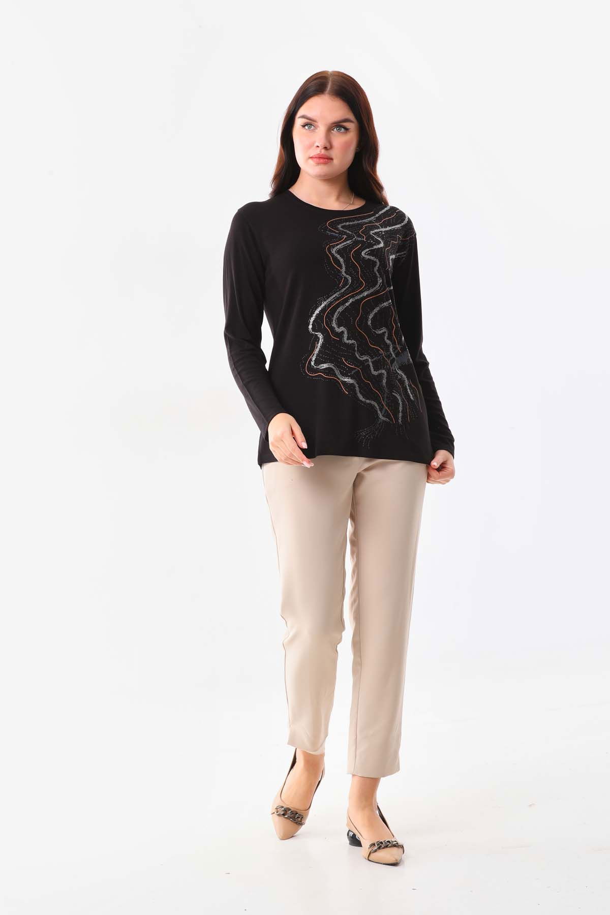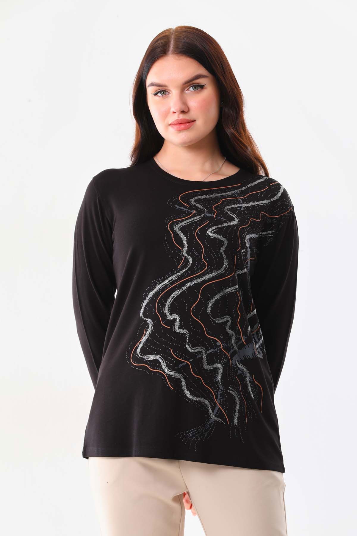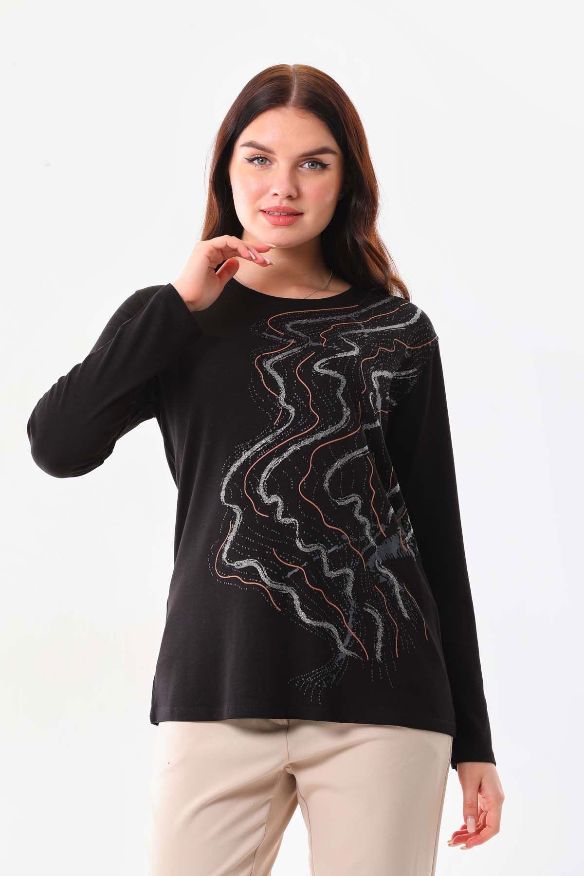 Sistas Kadın Desenli Bisiklet Yaka Uzun Kollu Bluz 23636 Siyah