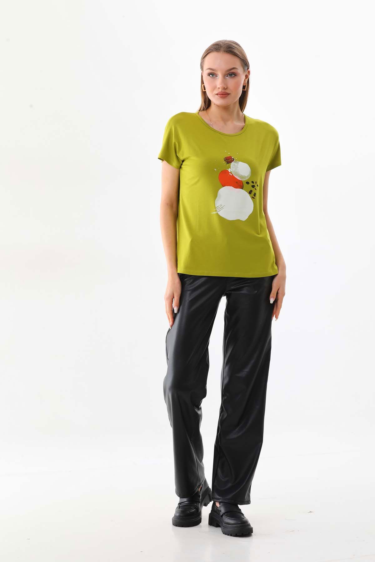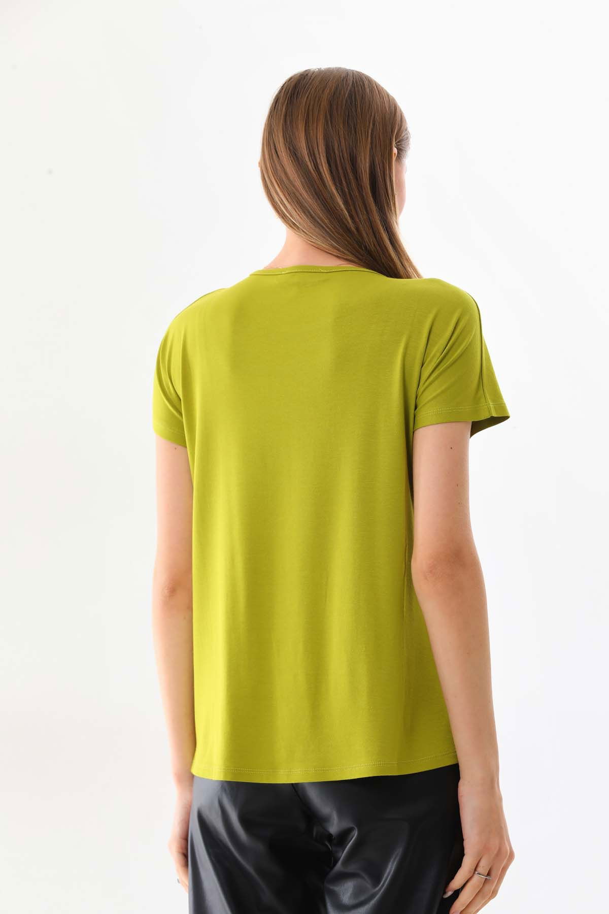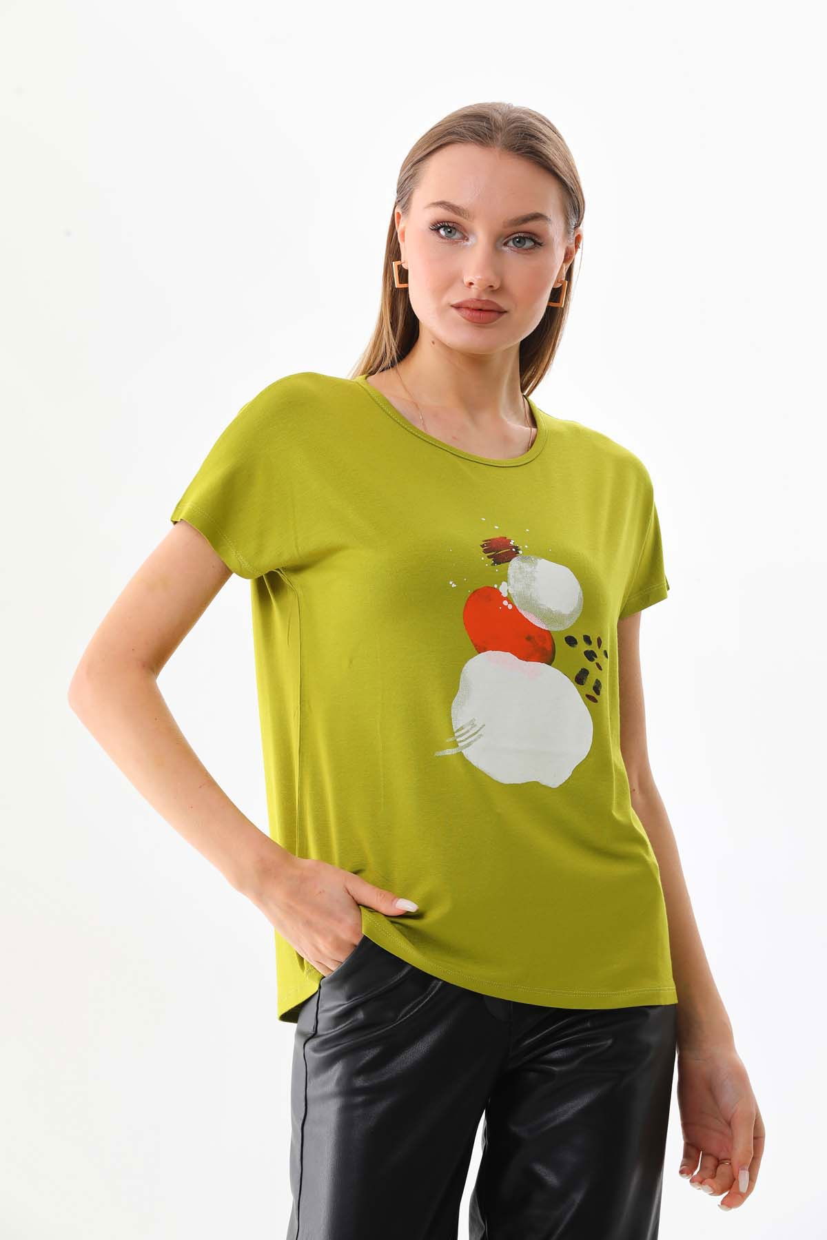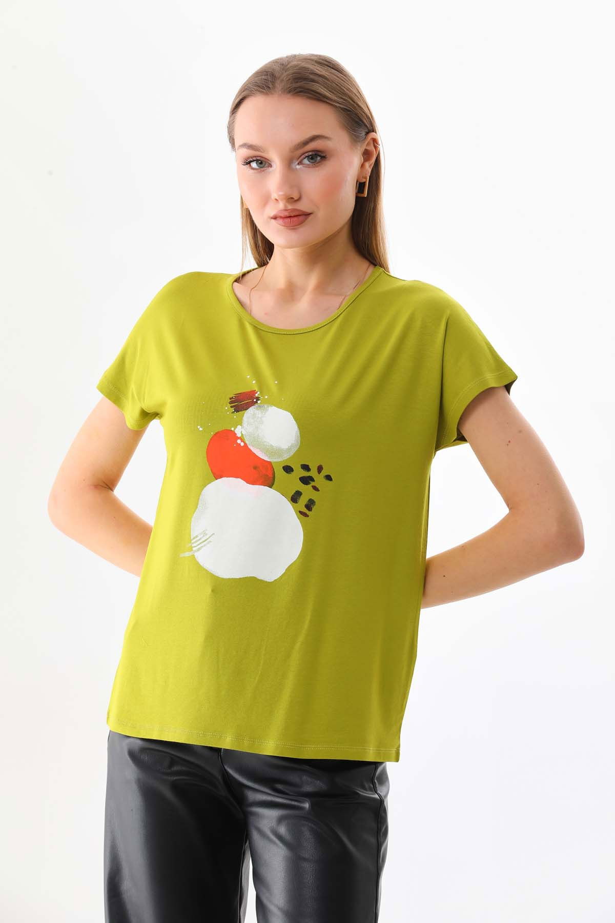 Sistas Kadın Desenli Kısa Kol Penye Bluz 23003 Yağ Yeşili