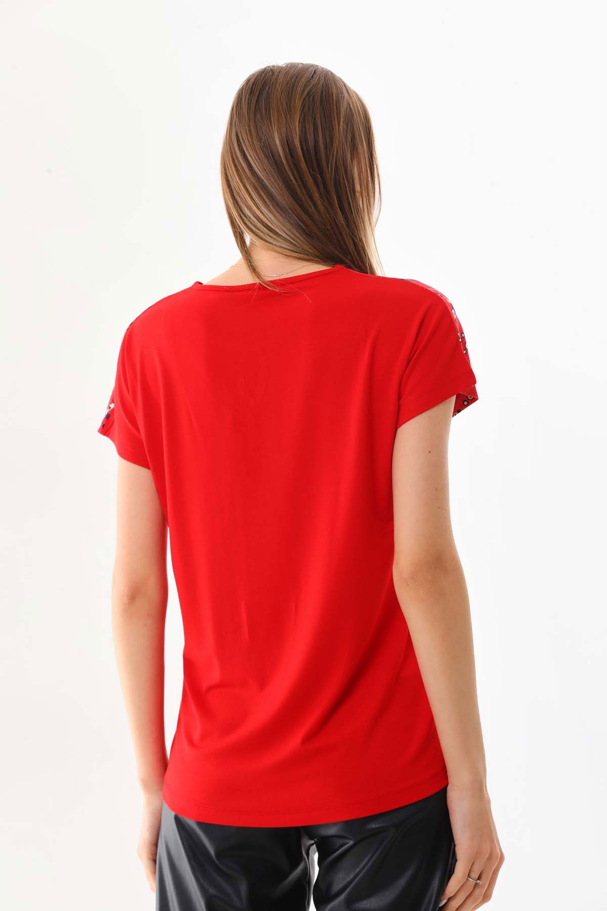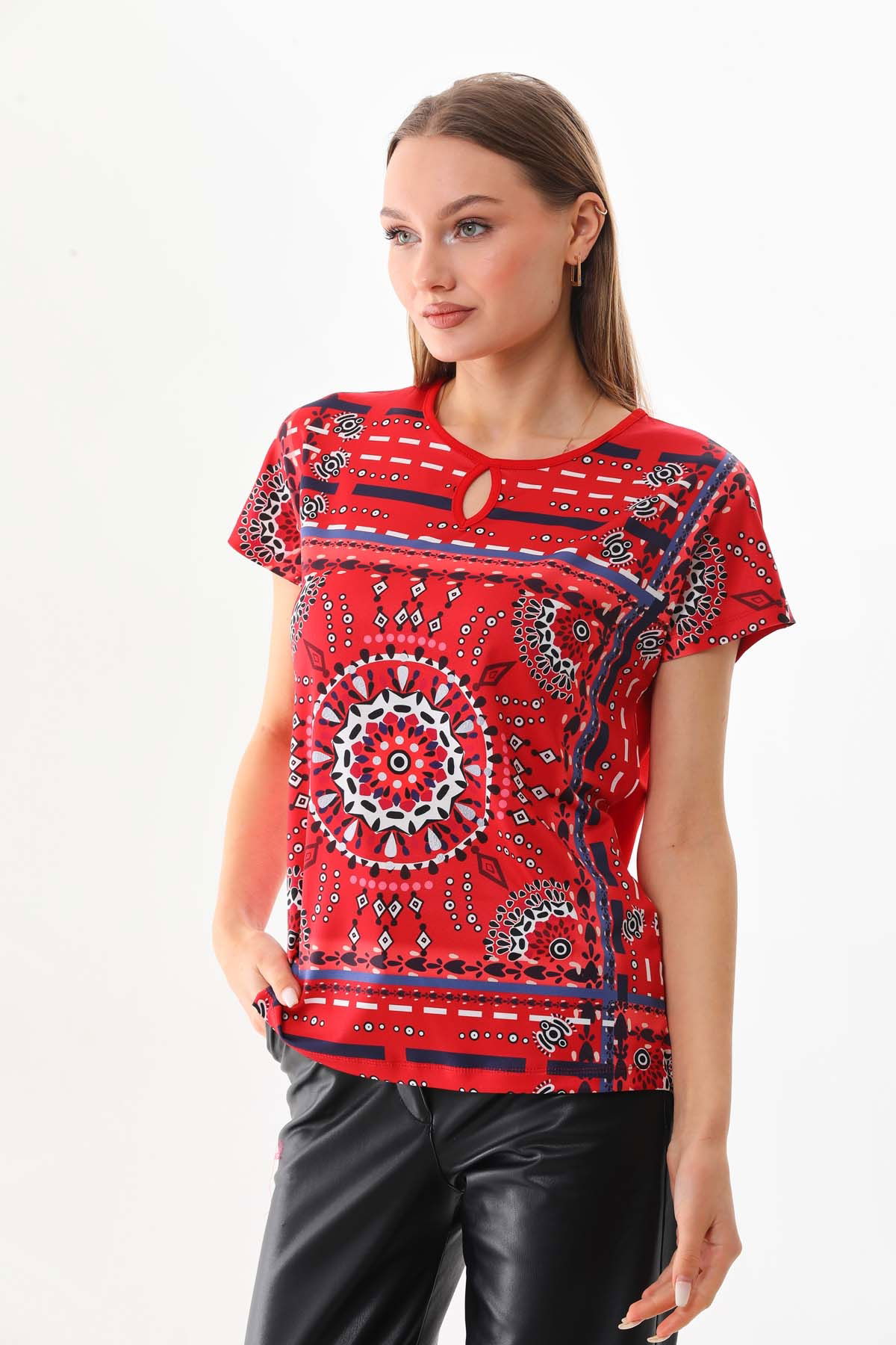 Detay: Kısa kol, pencere detaylı, desenli bluz;
