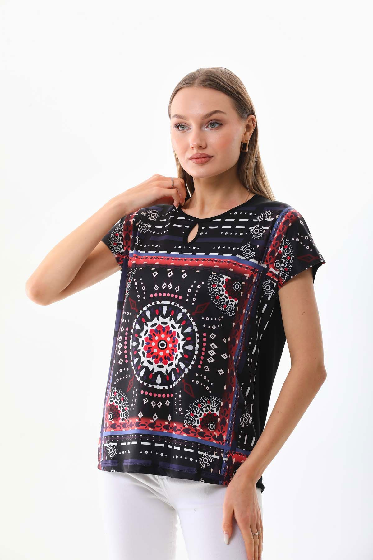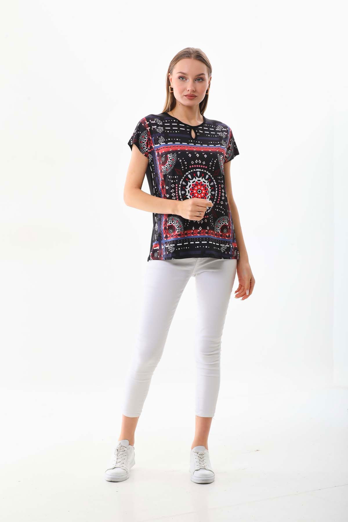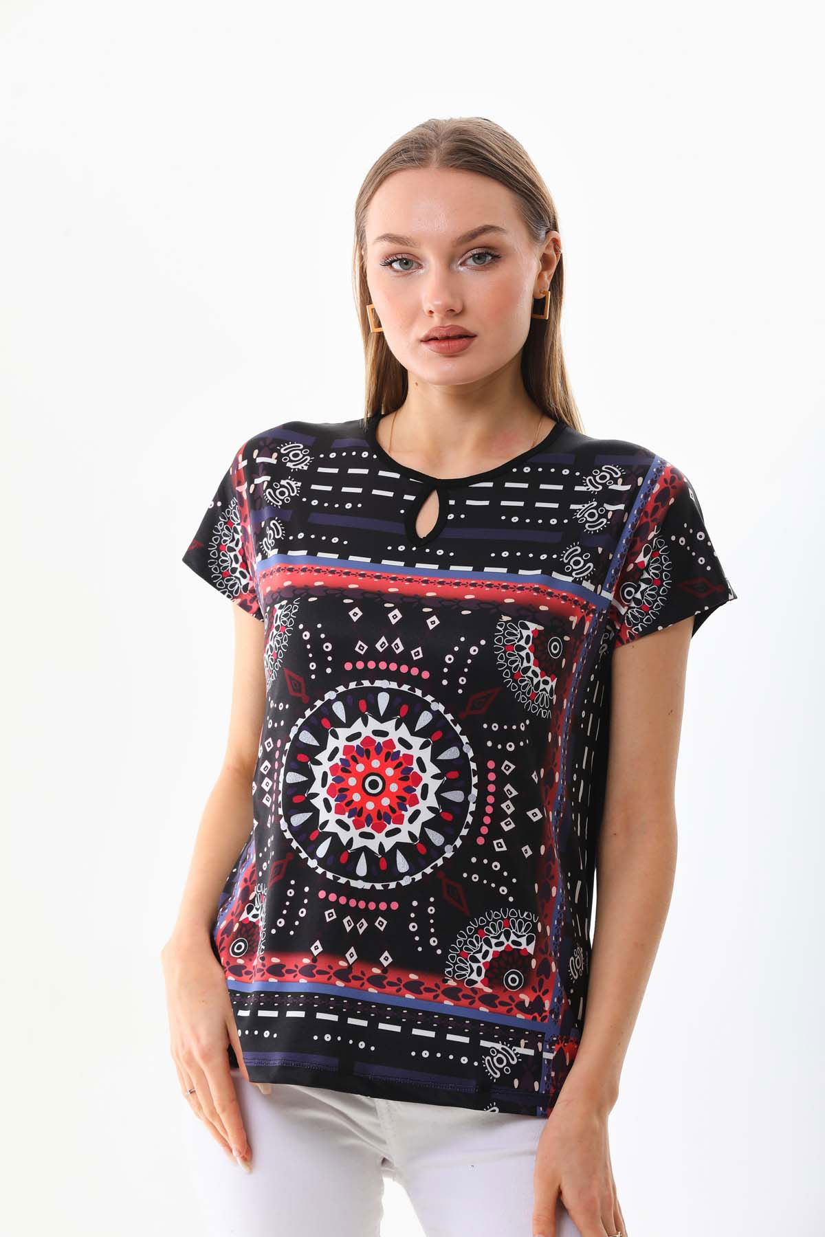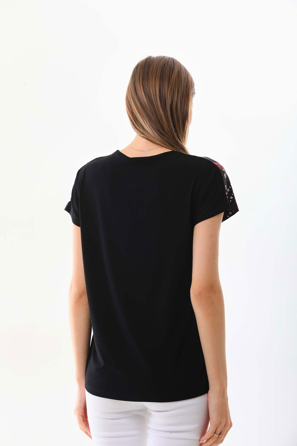 Sistas Kadın Desenli Pencere Detaylı Kısa Kol Bluz 23145 Siyah