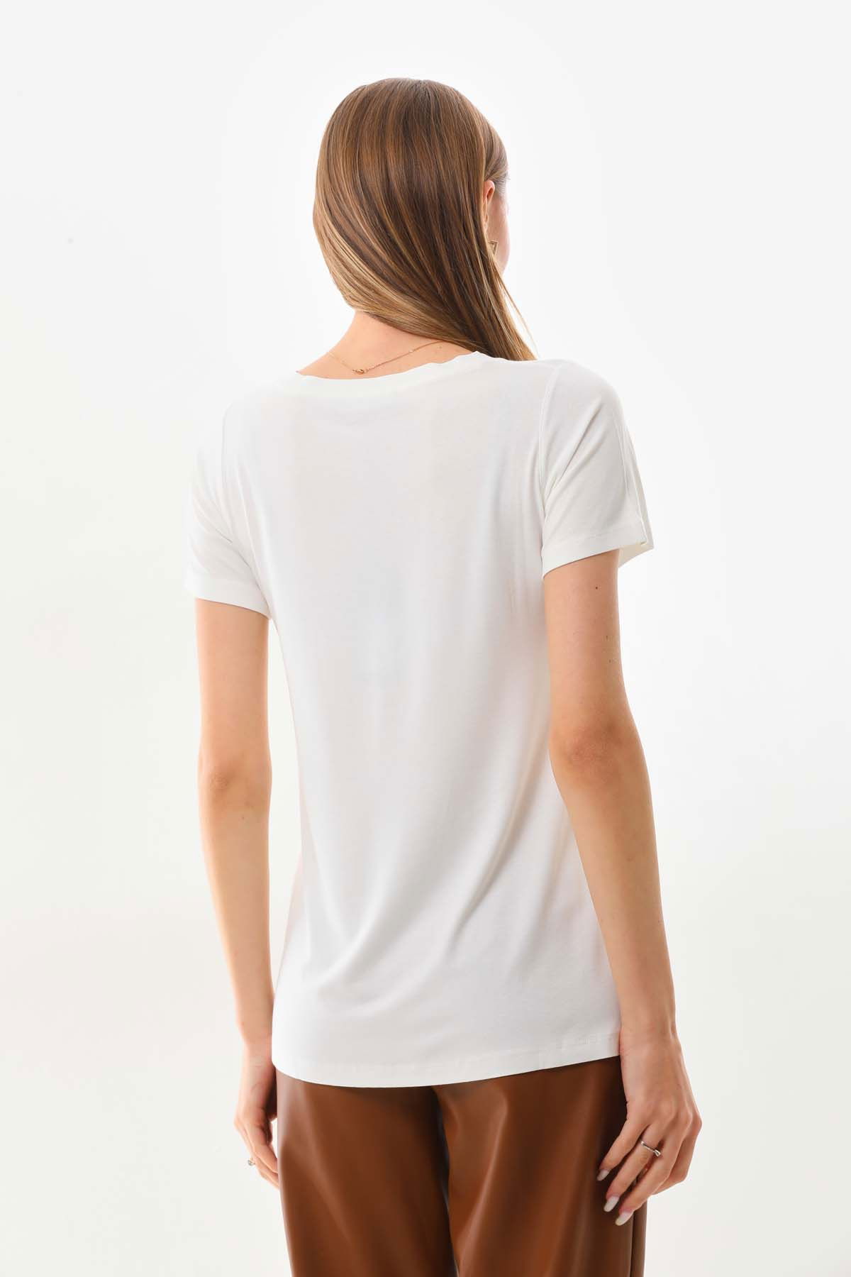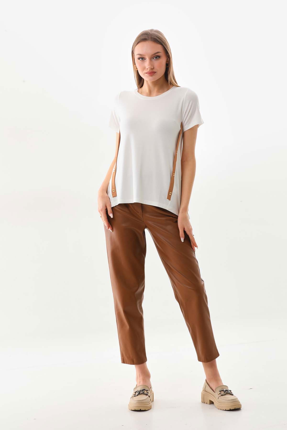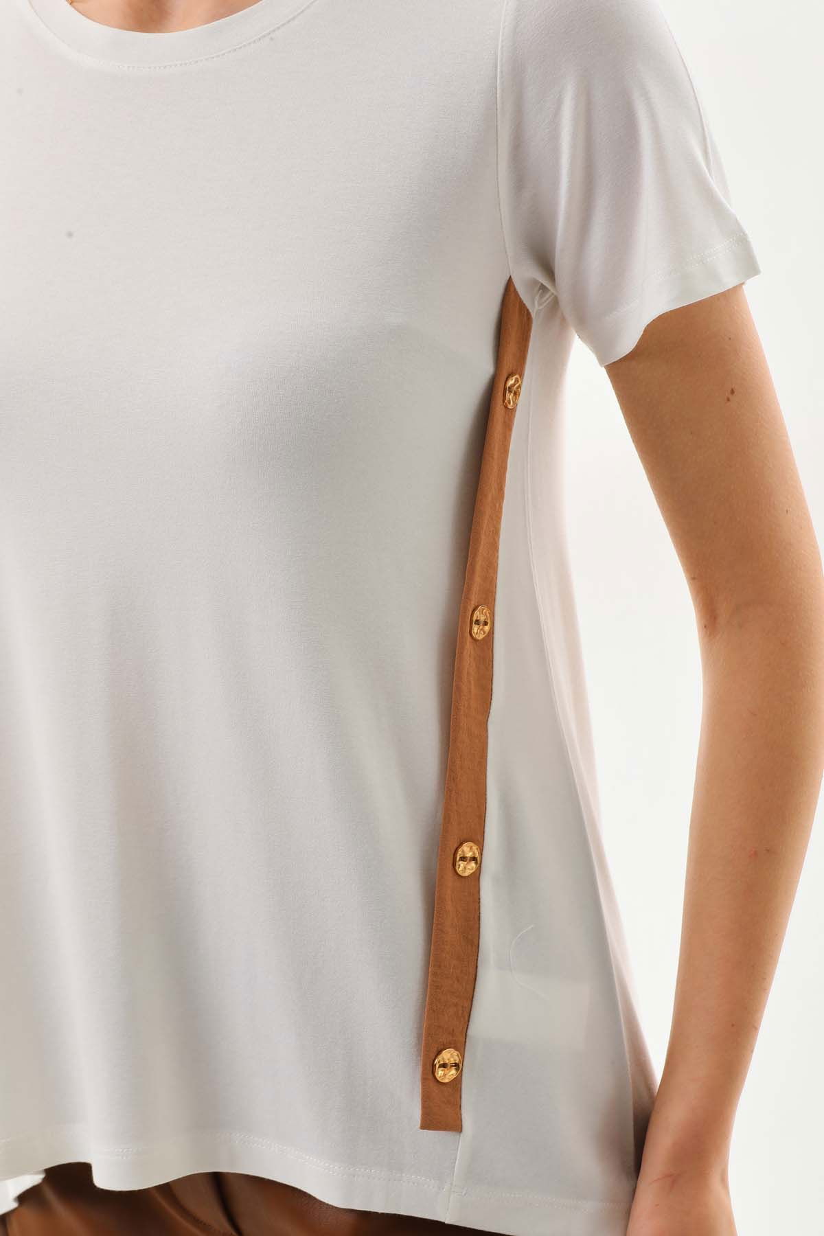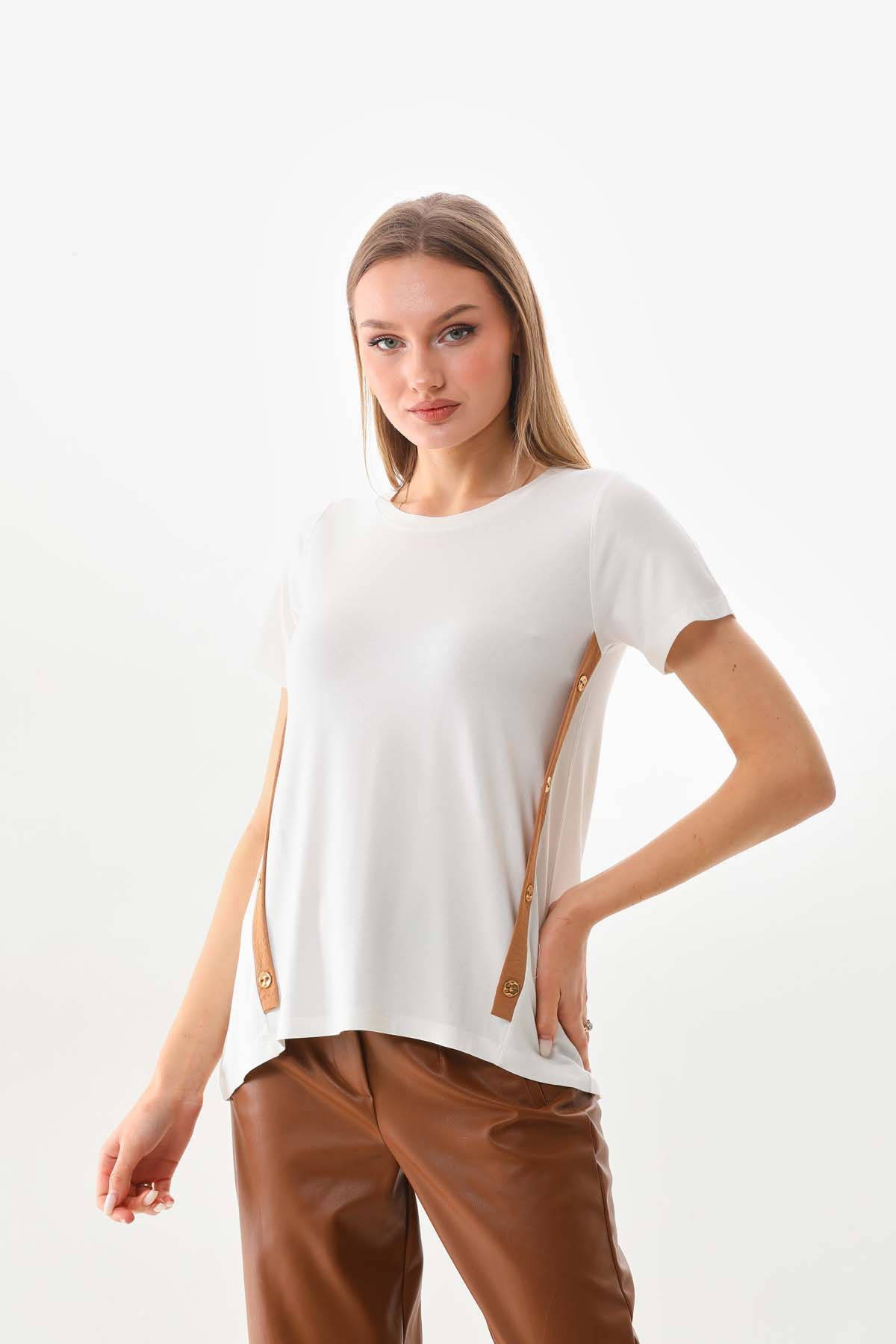 Sistas Kadın Düğme ve Şerit Detaylı Kısa Kol Bluz 23119 Ekru-Camel