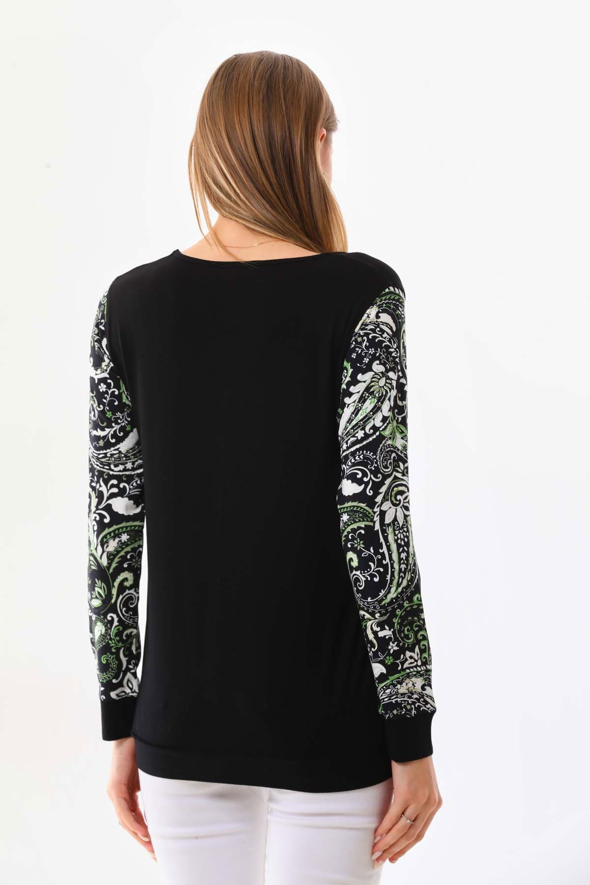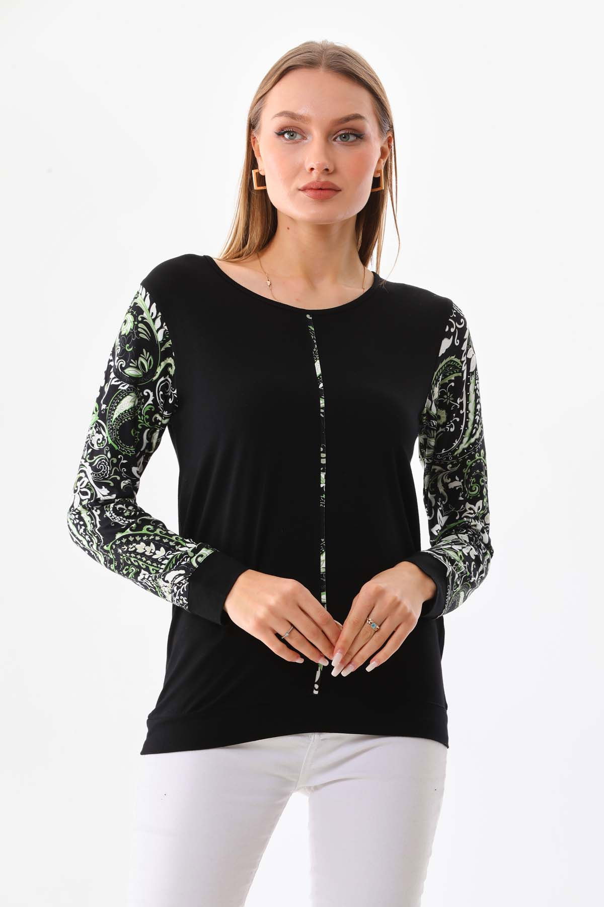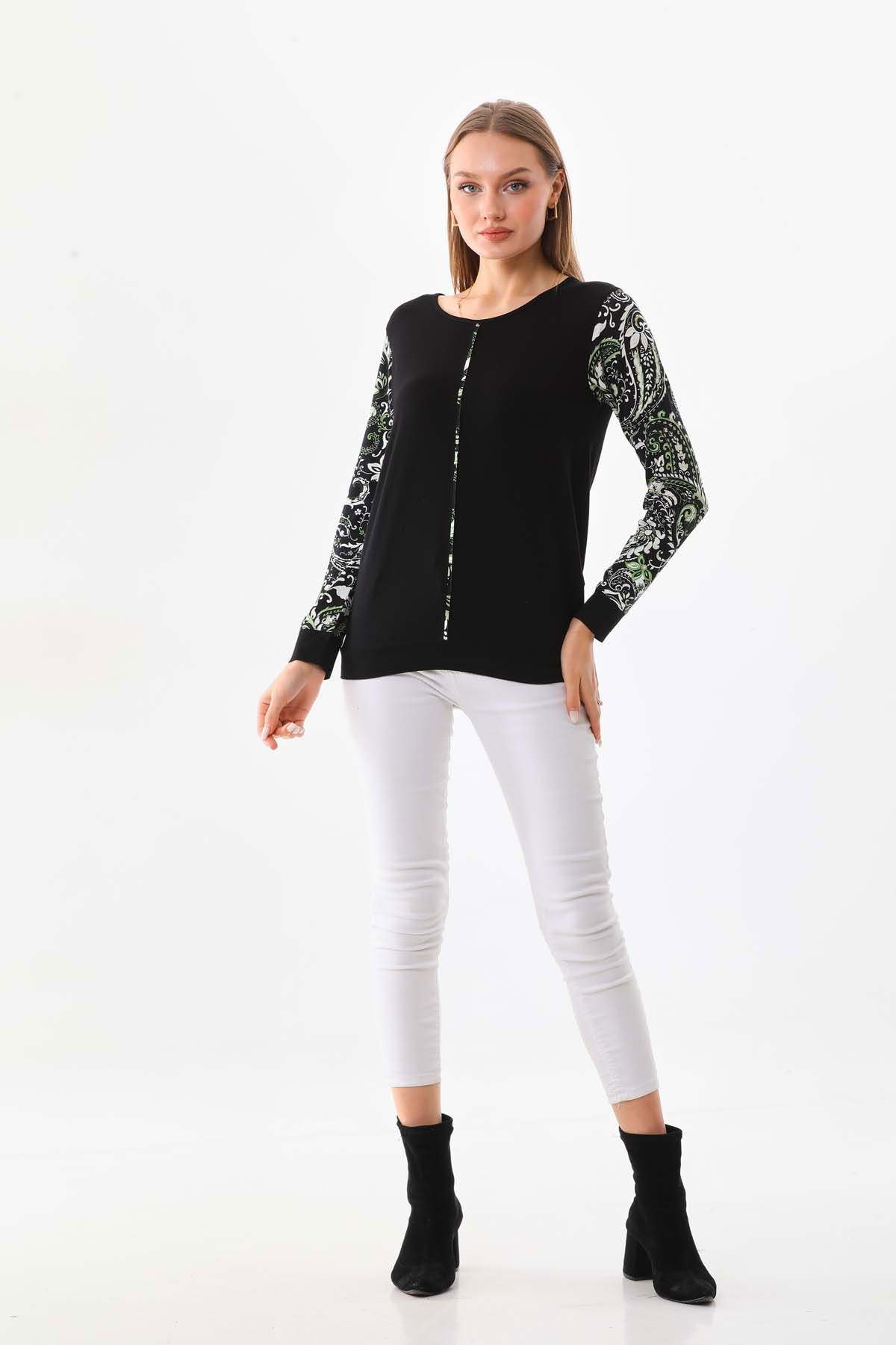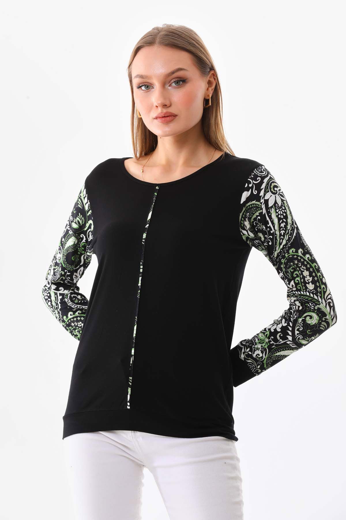 Detay: Uzun kol, bisiklet yaka, kolları desenli bluz;