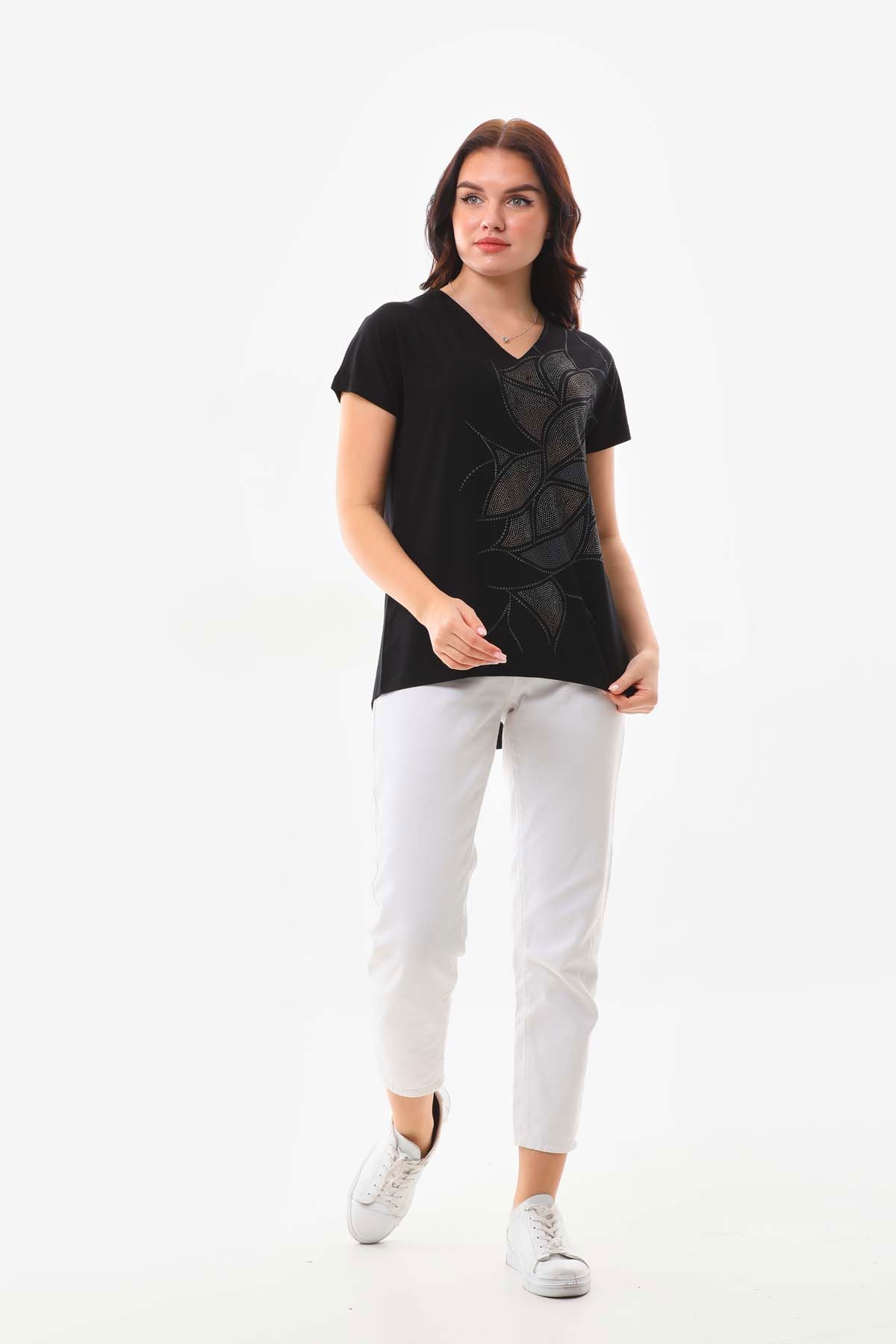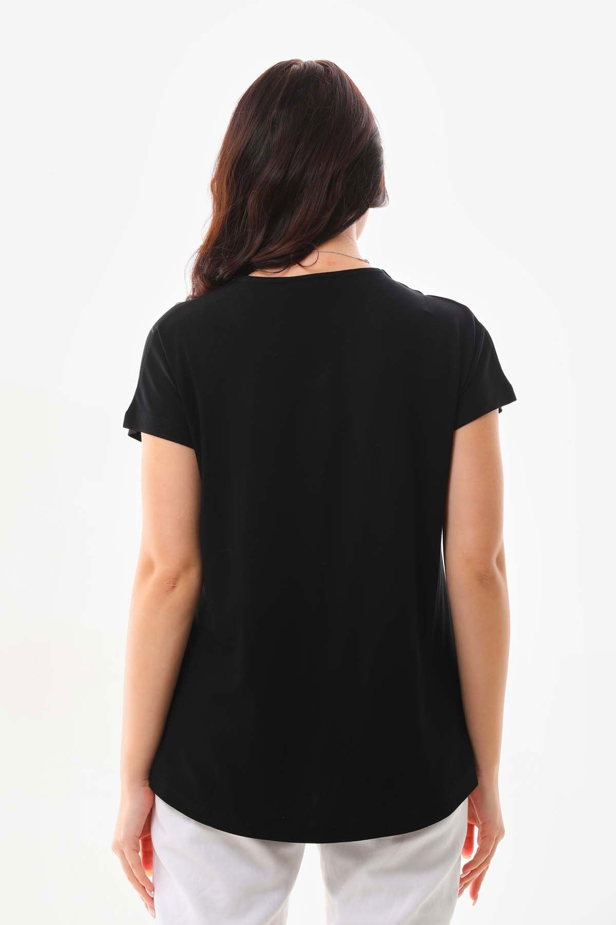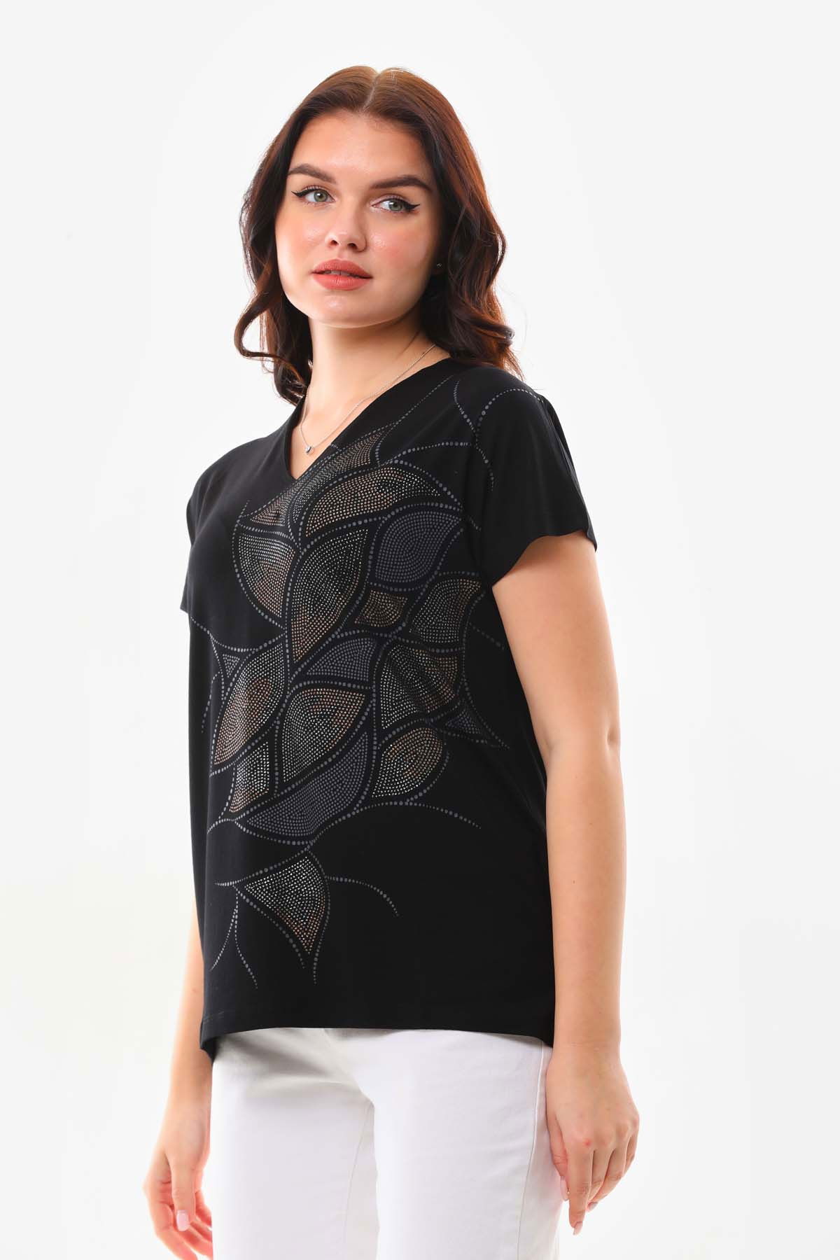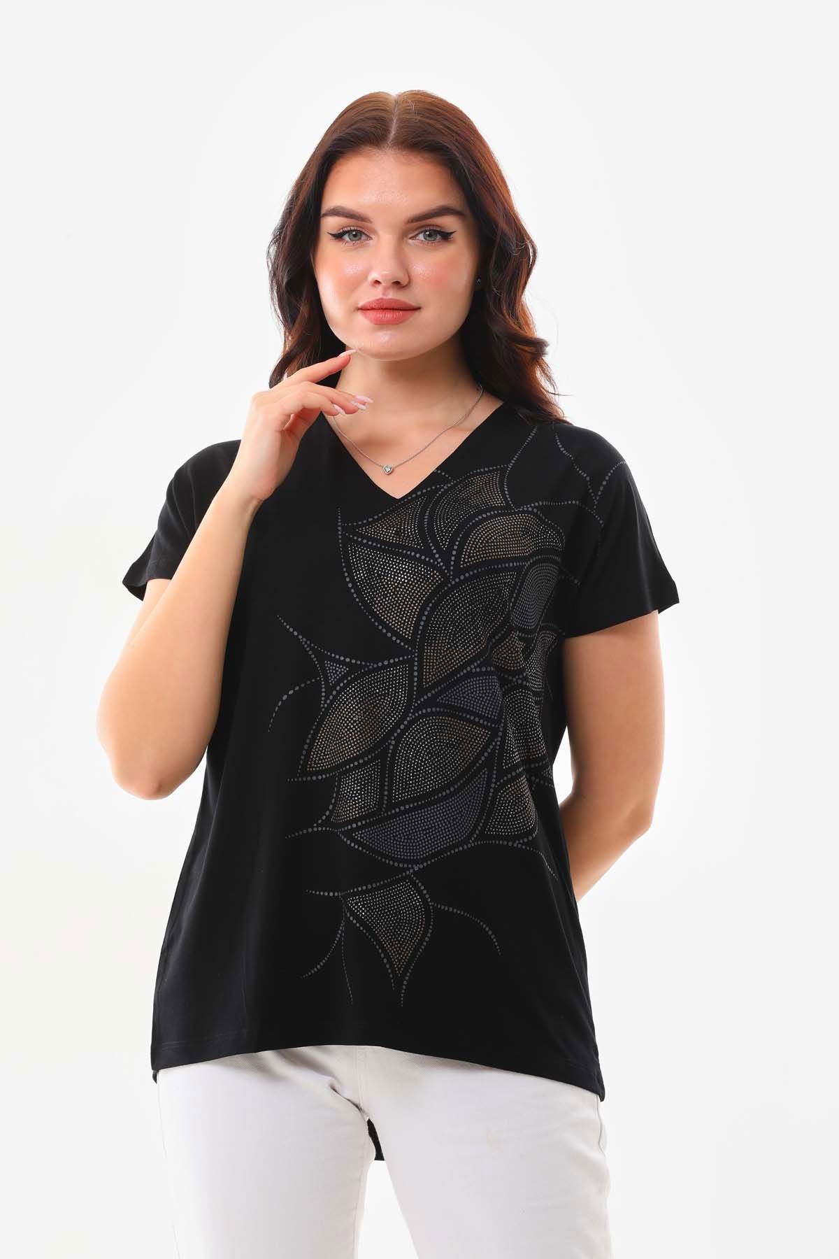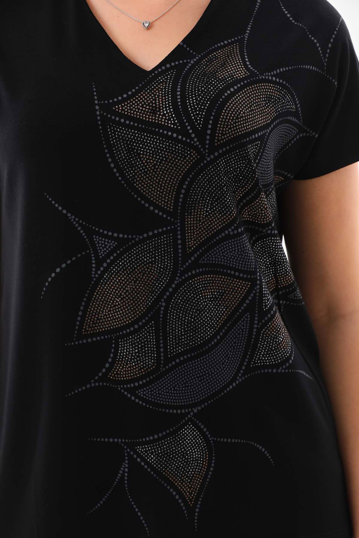 Sistas Kadın Simli Baskılı V Yaka Kısa Kol Bluz 23296 Siyah