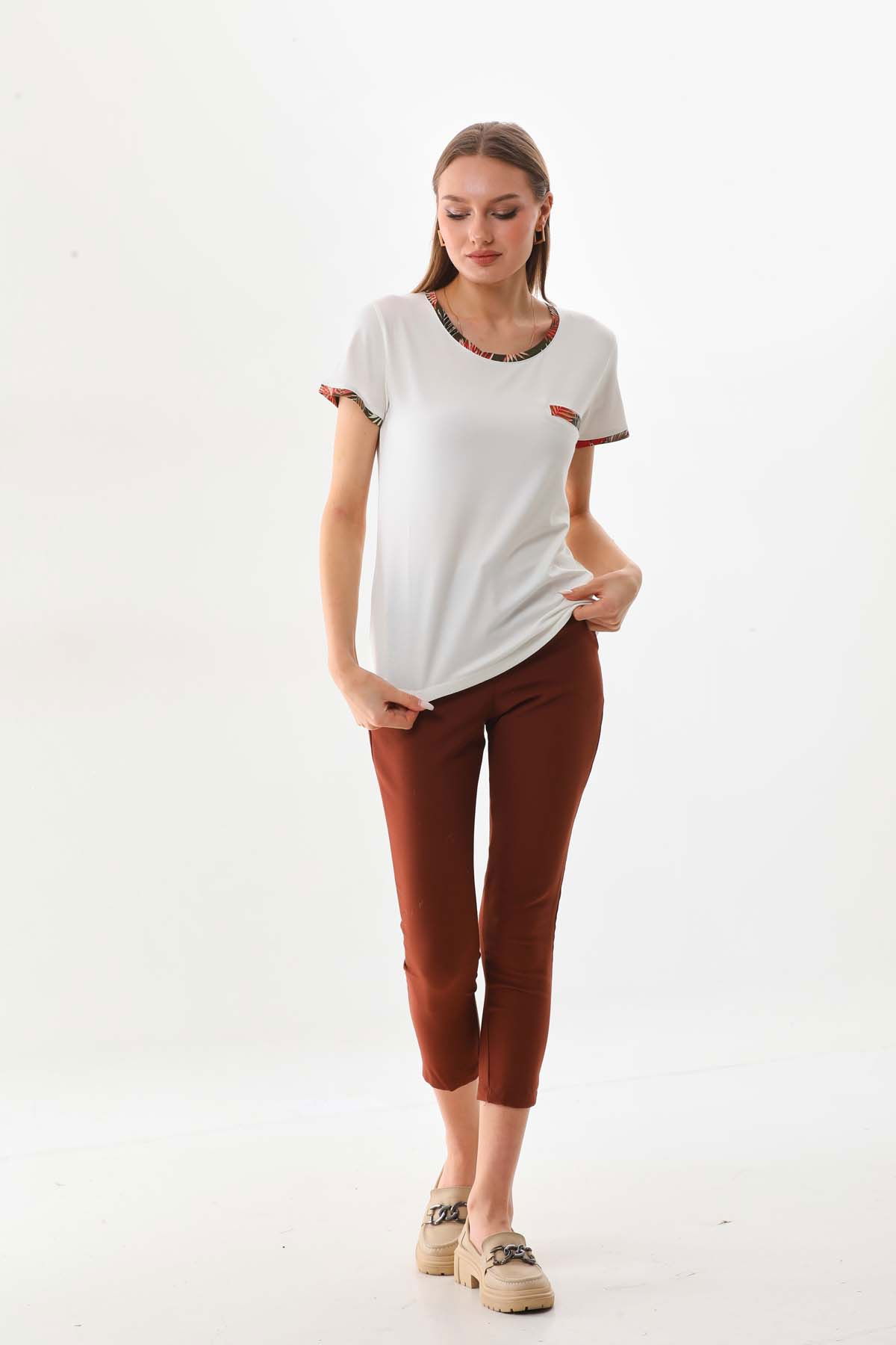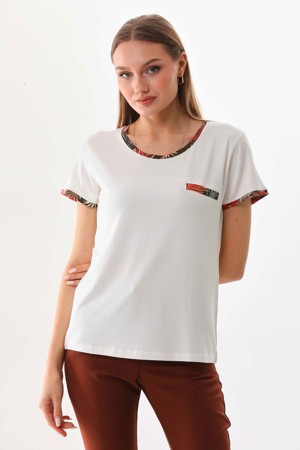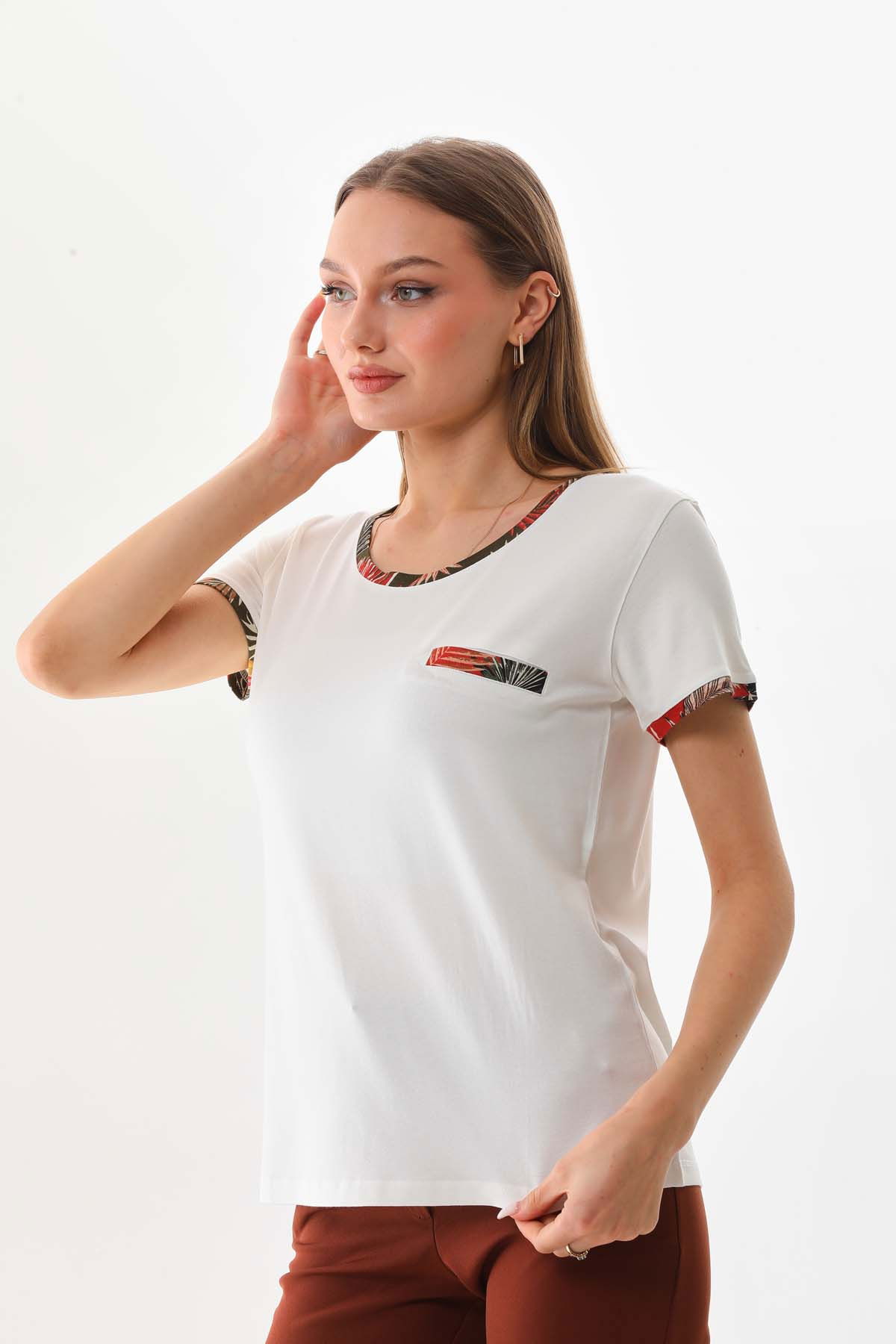 Detay: Kısa kol, bisiklet yaka, süs cepli bluz;