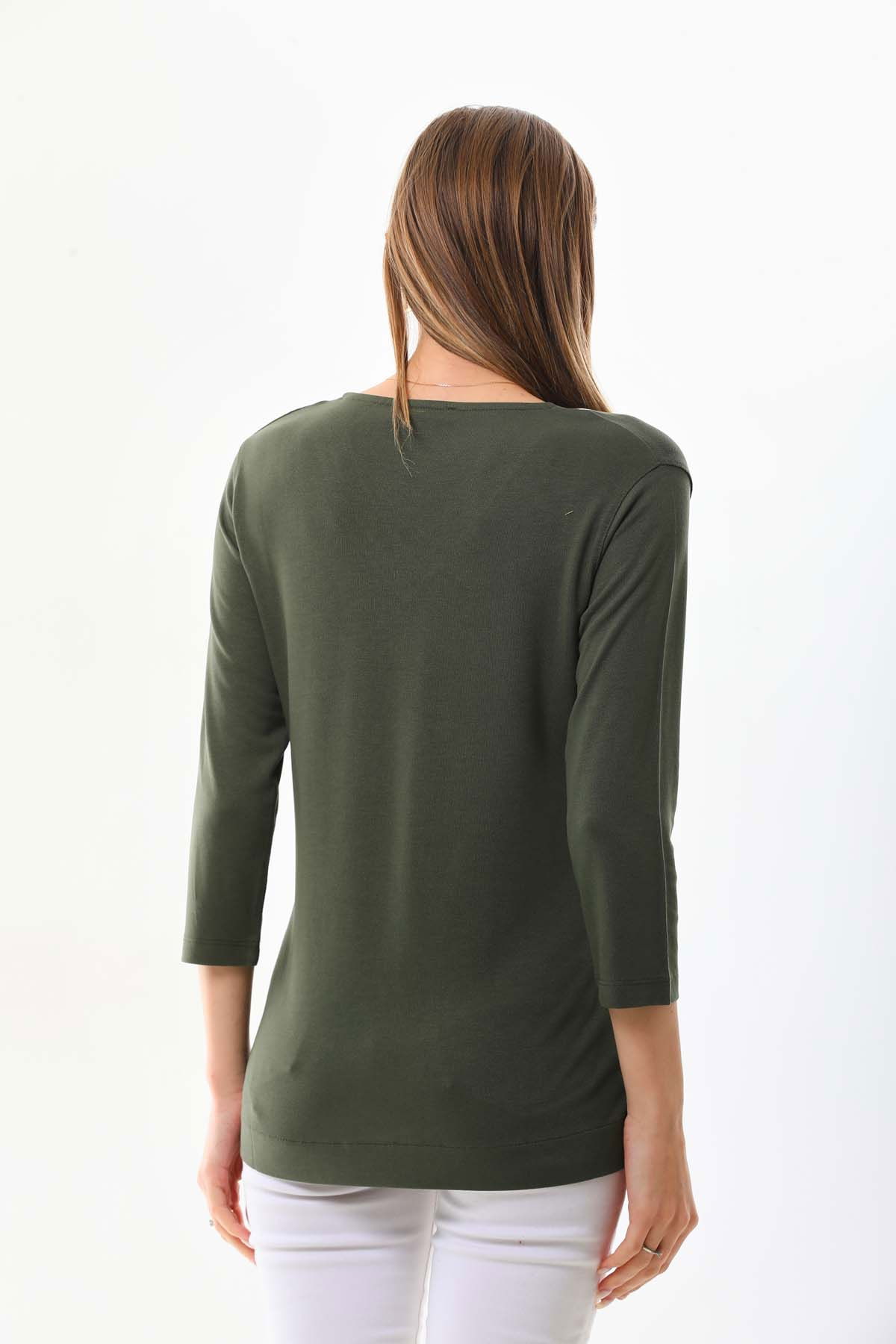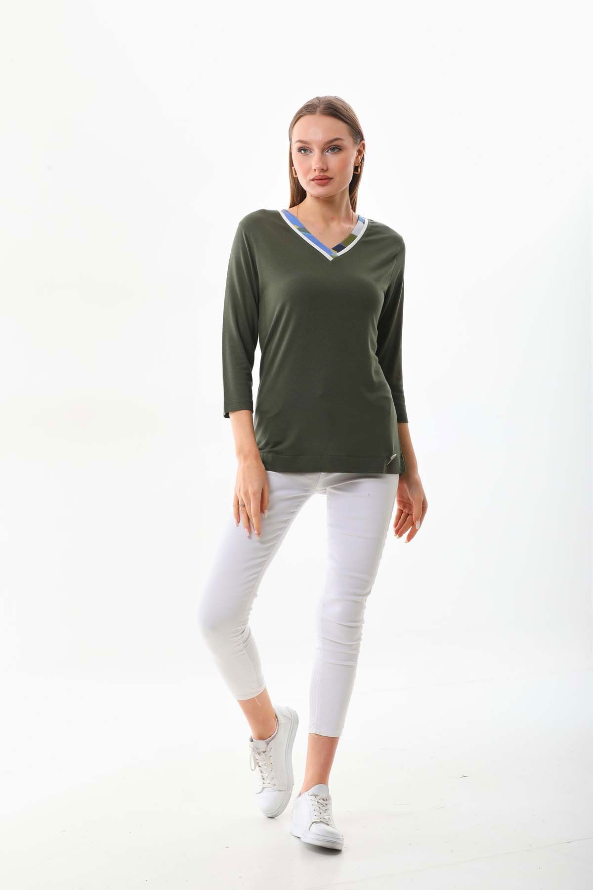 Detay: V yaka, yaka kısmı renk geçişli, etek kısmında küçük şemsiye işlemeli bluz;