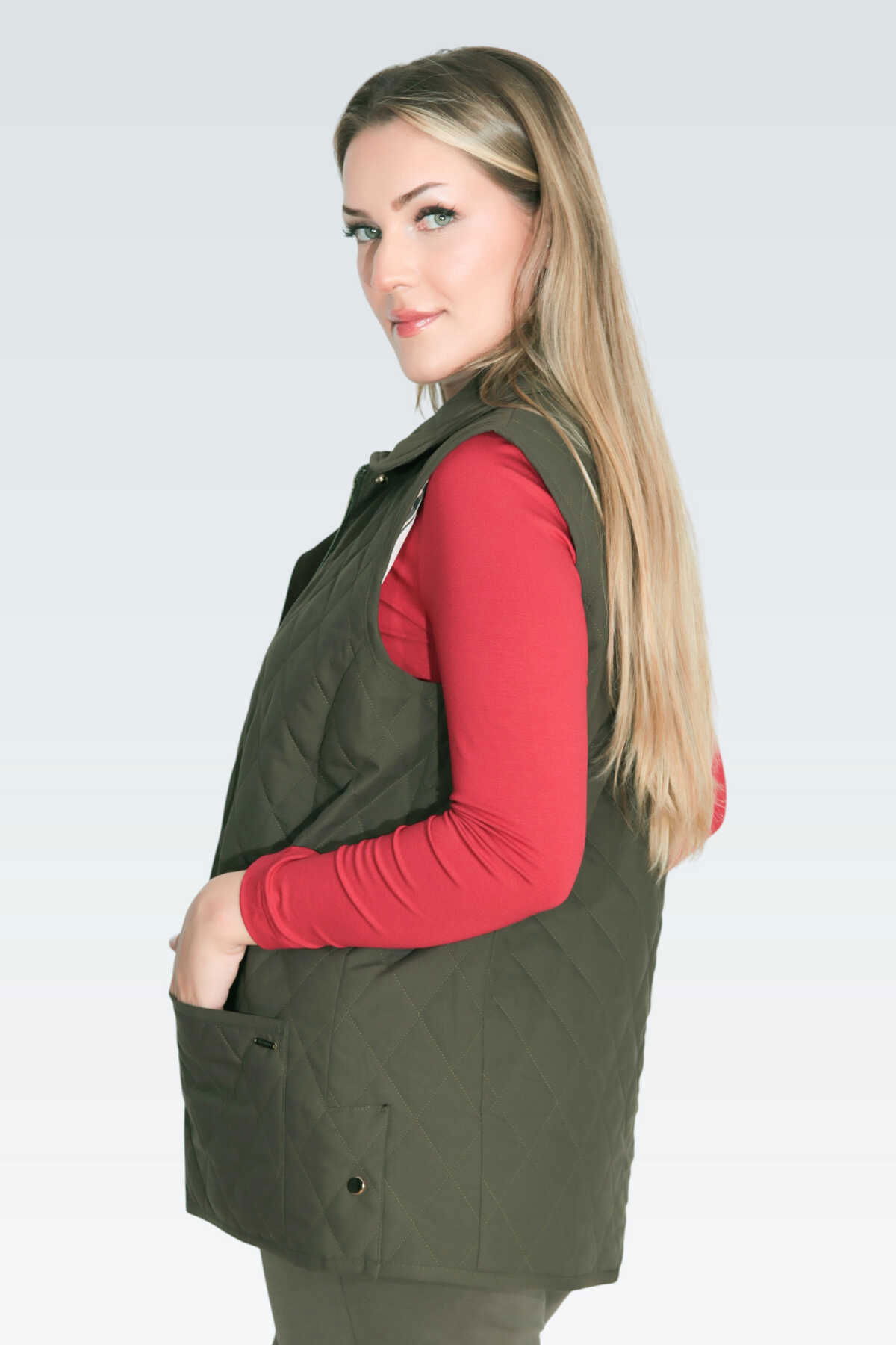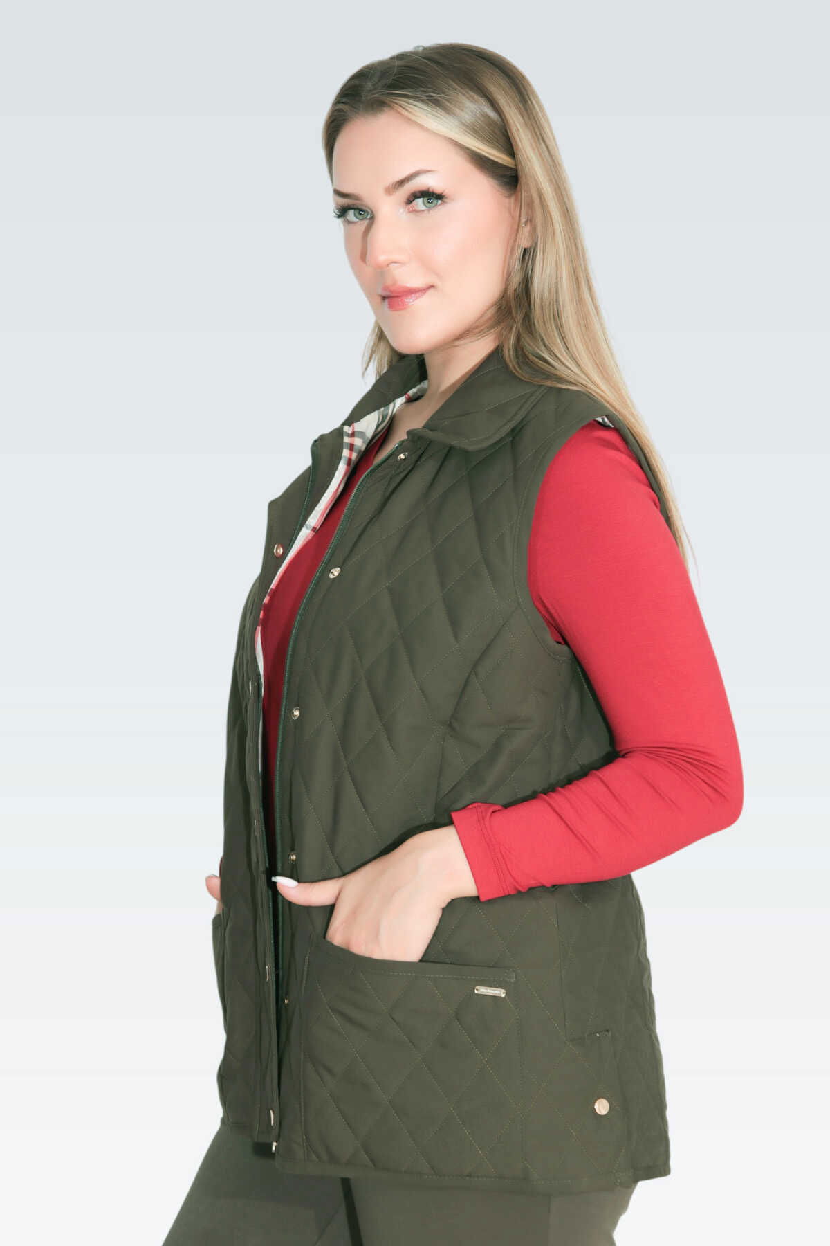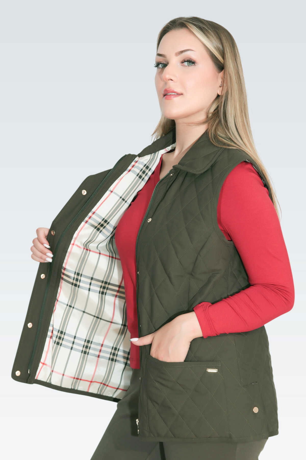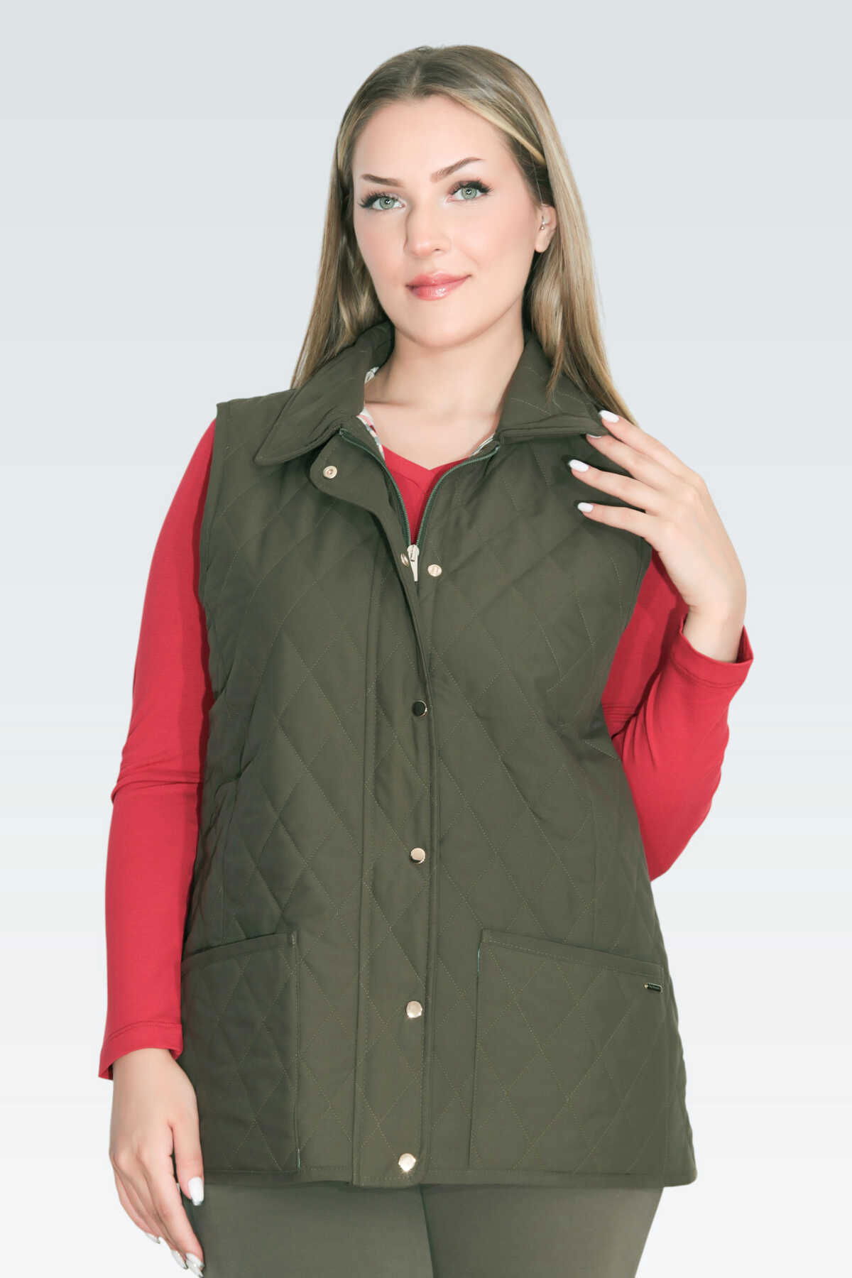 Detay: Orta kalınlıkta, yumuşak kapitone kumaştan üretilmiş bu cepli yelek, hem şıklığı hem de fonksiyonelliği bir arada sunar. Desenli astarıyla iç detaylarda zarif bir dokunuş sağlarken, fermuarlı ve çıtçıtlı kapama sistemi pratik kullanım imkânı verir. Midi boyu ve yırtmaç detayı hareket özgürlüğü sunarken, mevsim geçişlerinde stilinizi tamamlayan modern ve kullanışlı bir parçadır;