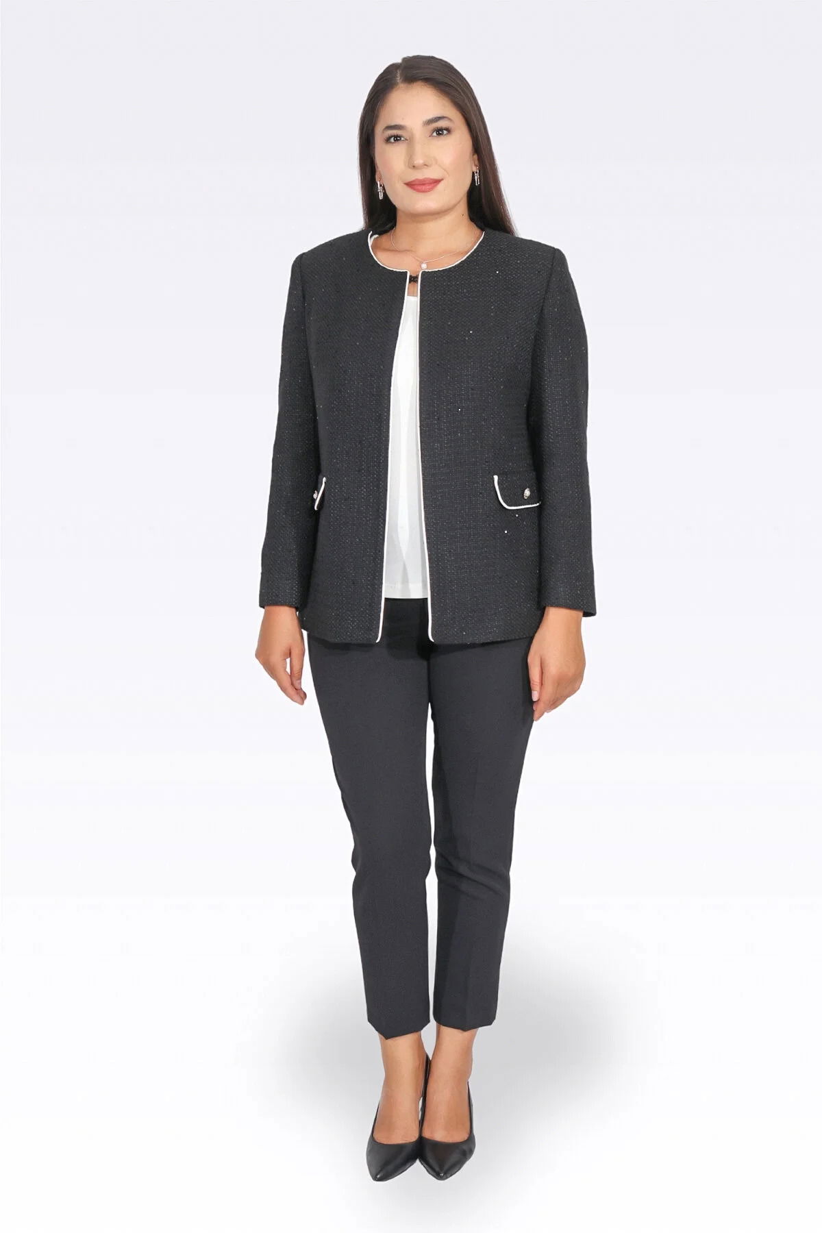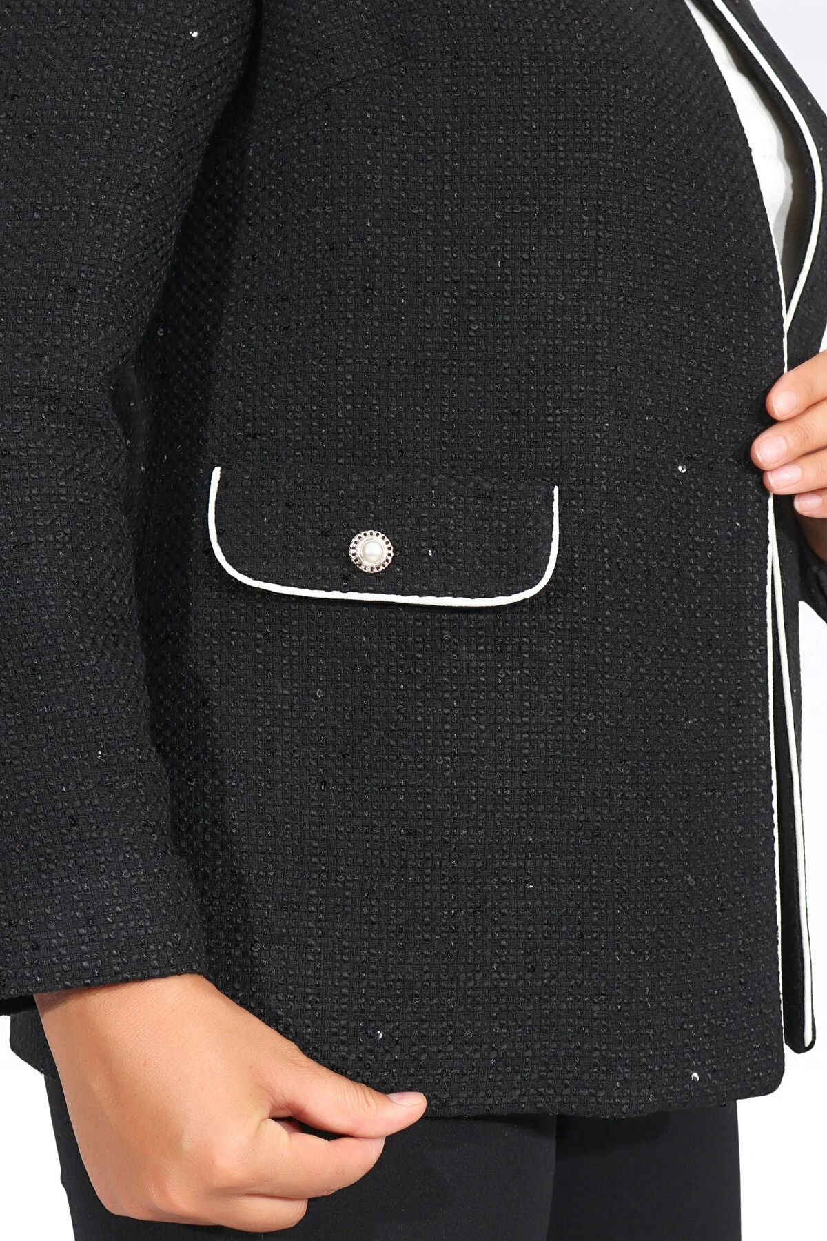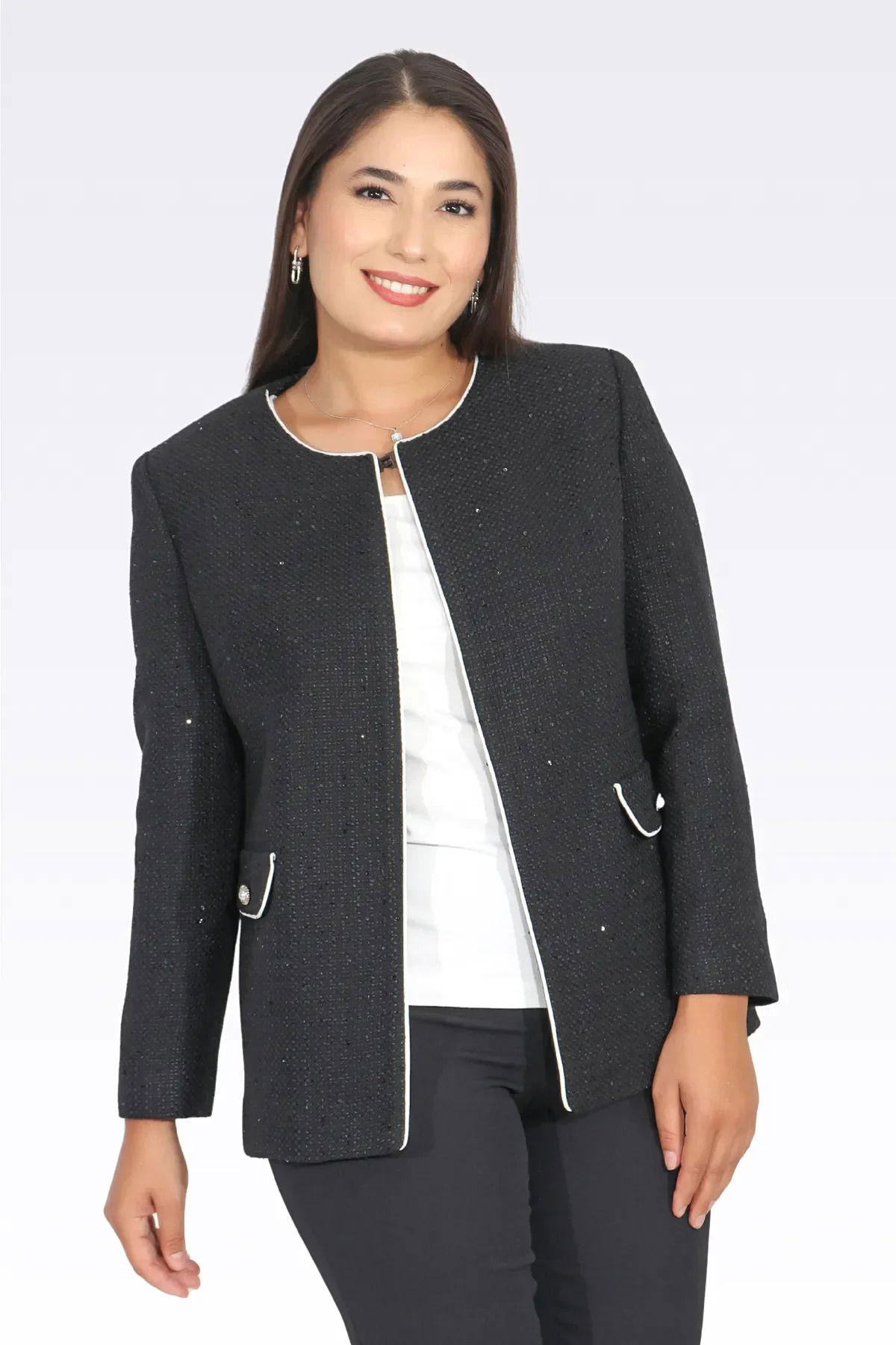 Detay: Simli kumaştan üretilen sıfır yaka, astarlı ceket; zarif duruşuyla özel günlerde şıklığınızı tamamlar. Biye detayları sayesinde modern ve dikkat çekici bir görünüm sunar. Şık kullanım için ideal olan bu tasarım, stil sahibi kadınların gardırobunda yerini alıyor.;