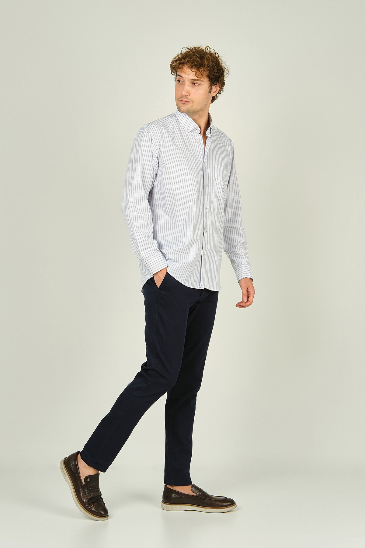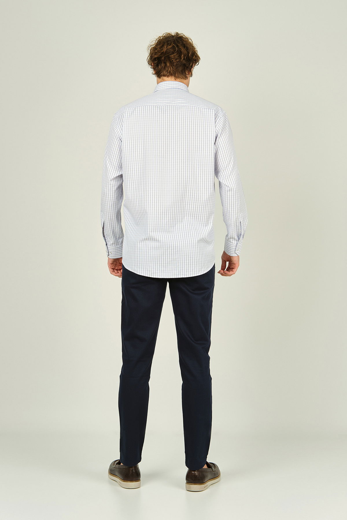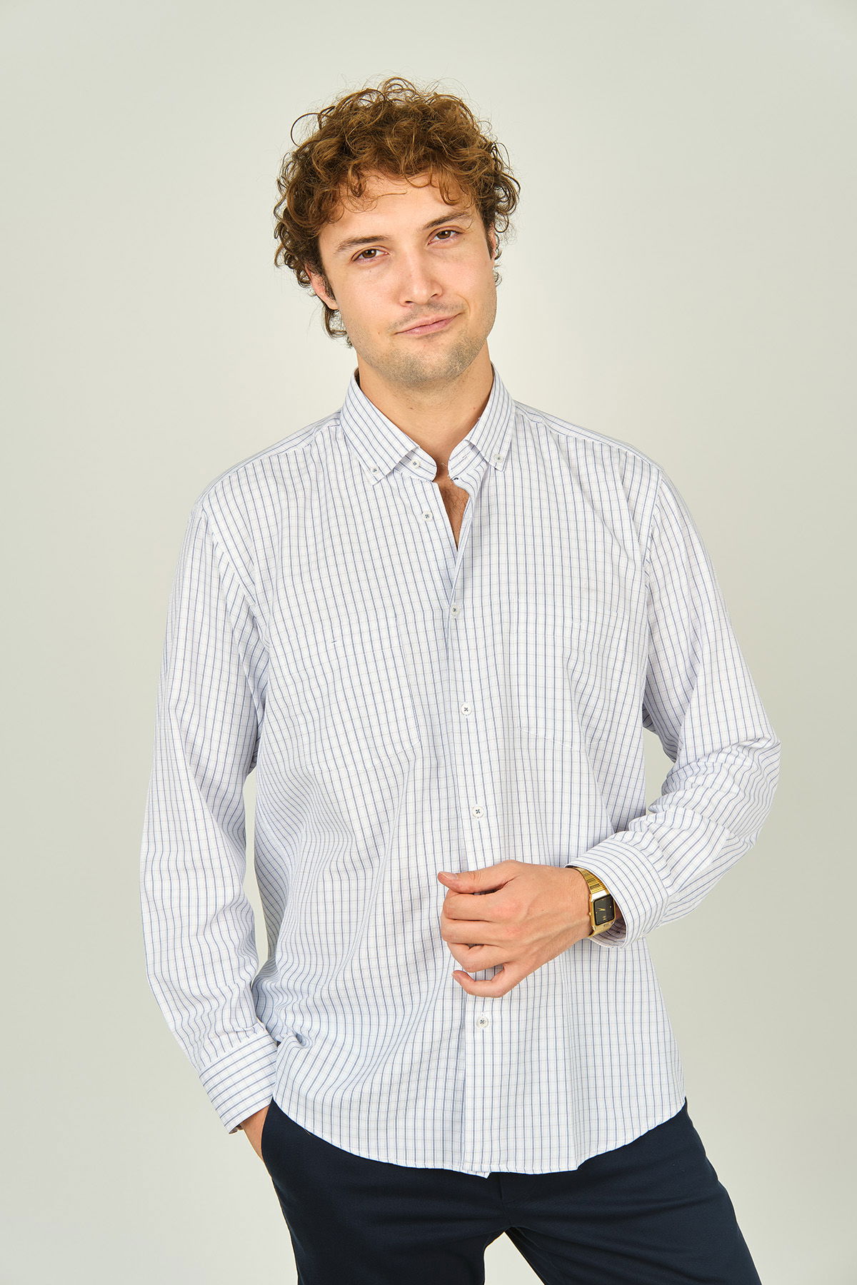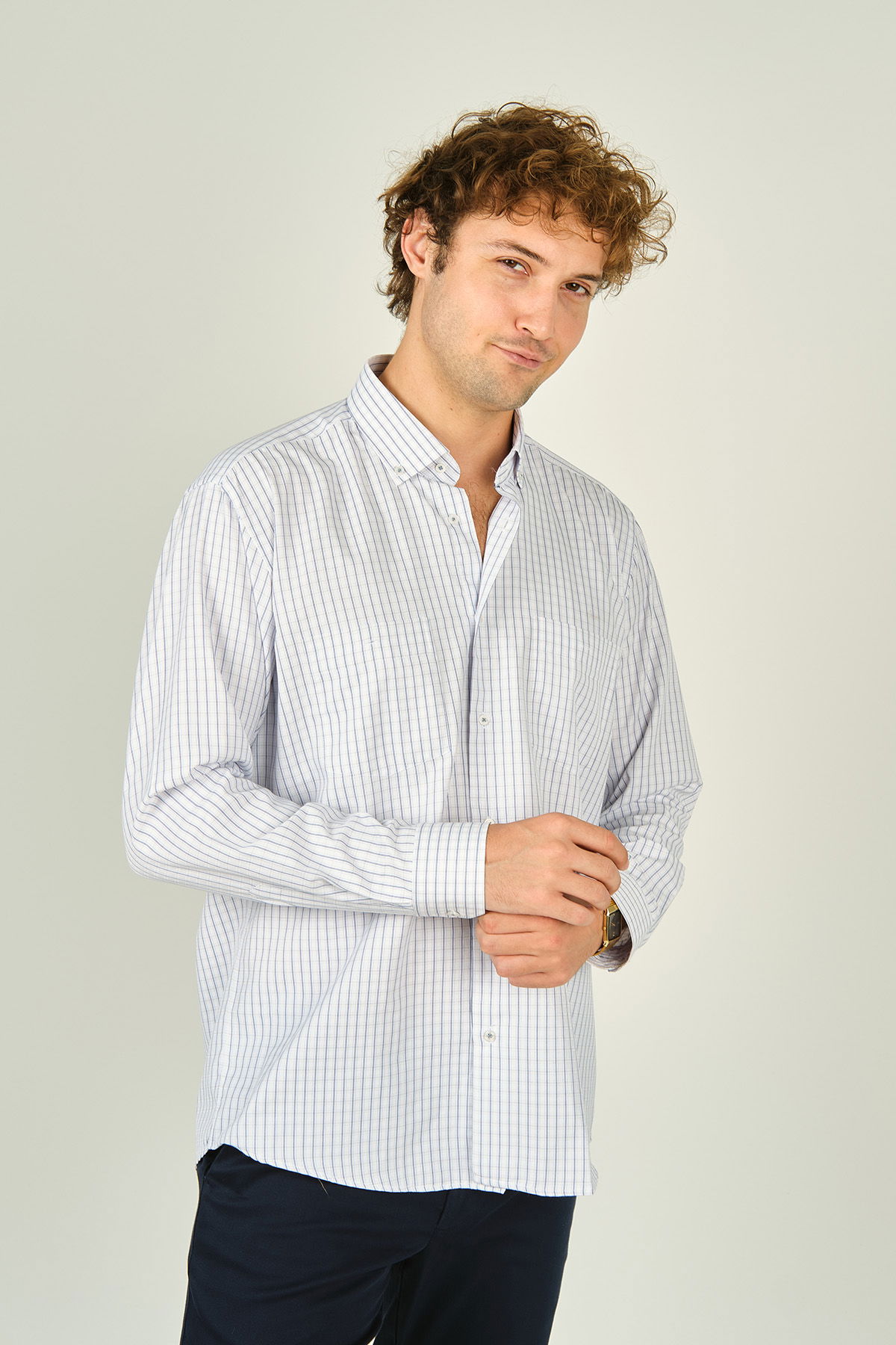 Detay: Uzun kollu, çift cepli, kare desenli, yaka düğmeli gömlek ;