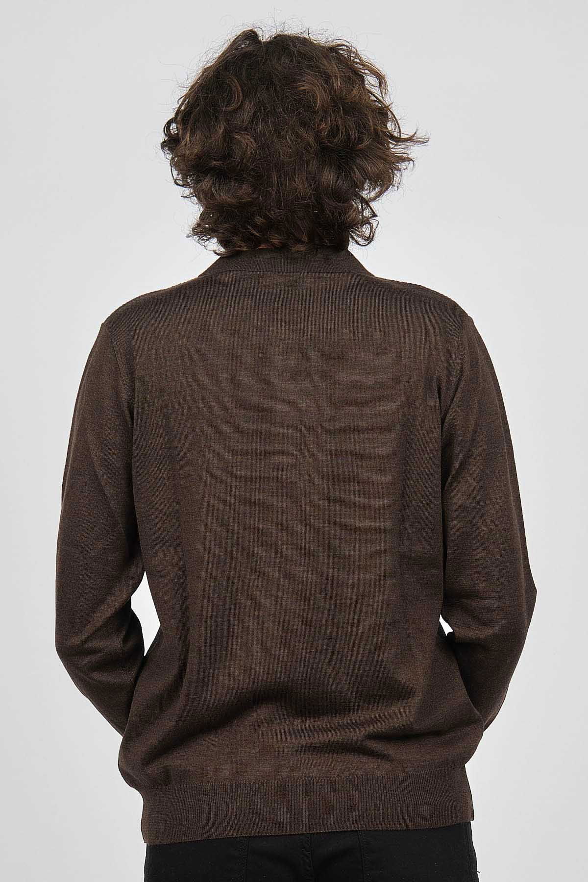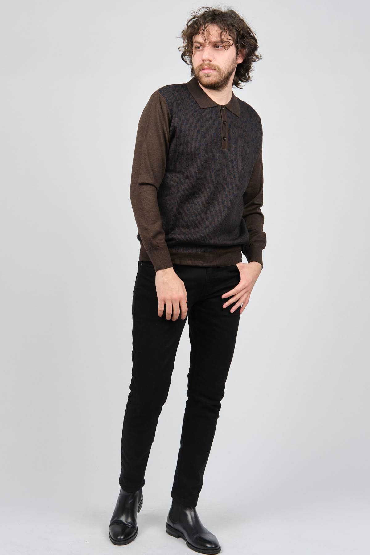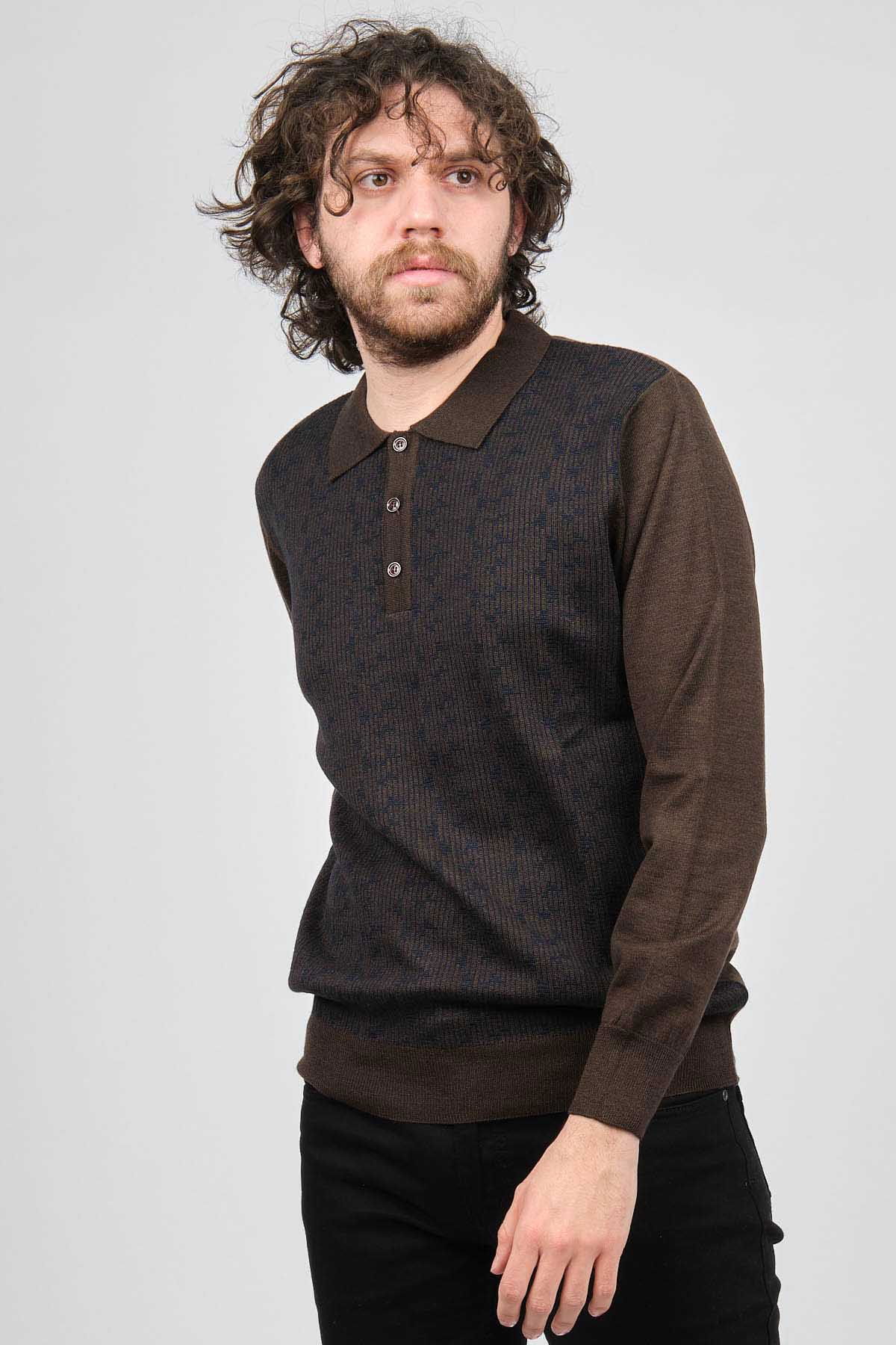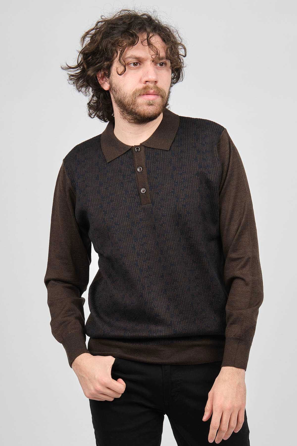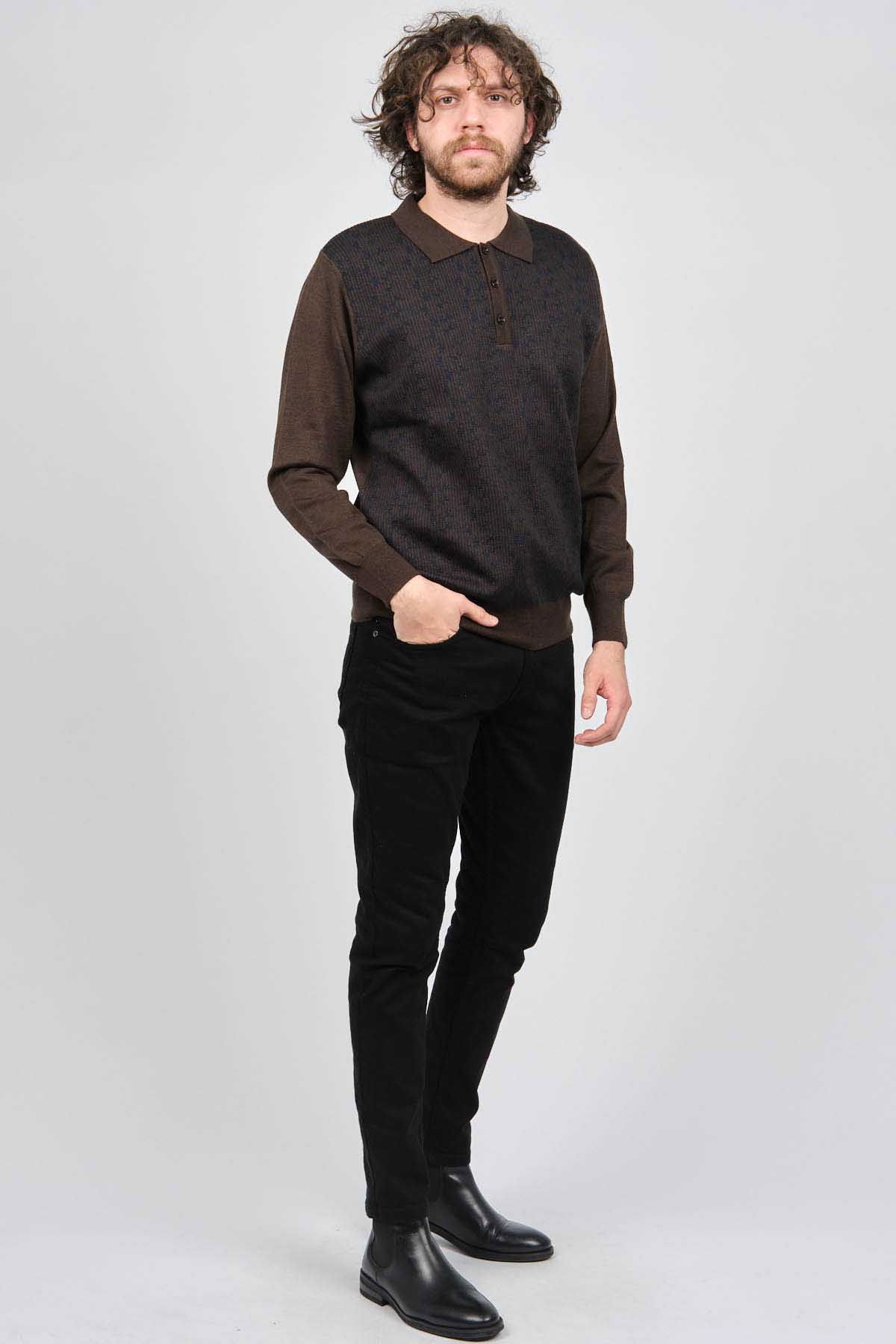 Detay: Düğmeli polo yaka, desenli, uzun kollu kazak;